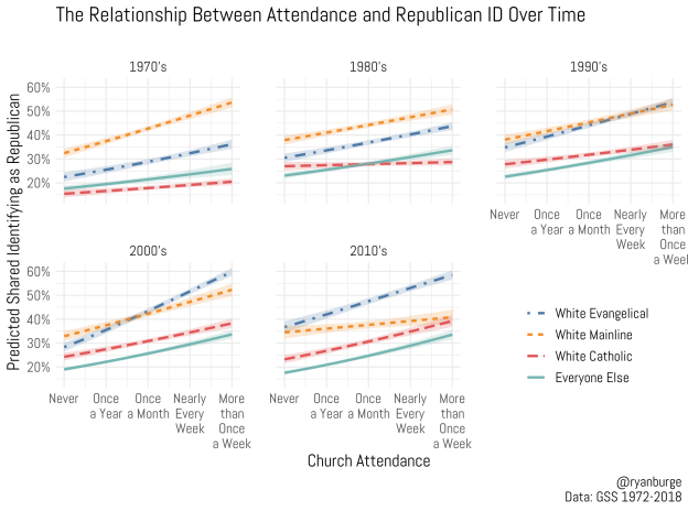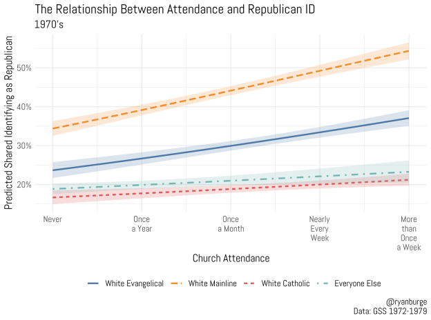 I ran a statistical model of identifying as a Republican with controls for education, age, and gender. I broke the sample up into the three types of white Christians: evangelicals, mainline, and Catholic, then left everyone else in the graph to give a comparison group. The results for each of the last five decades are visualized below (this is a three way interaction between worship attendance, religious tradition, and decade).