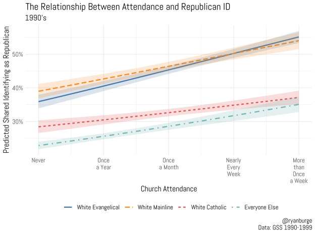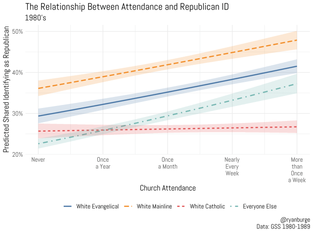 The 1980’s begin to bring about some interesting changes. Mainline Protestants still stand out, but their line has become flatter. While ~55% of the most active of them were Republicans in the 1970’s, that’s now declined to 48%. At the same time, the evangelical line has begun to pitch up significantly. At the top end of attendance, Republican identity jumped about five percentage points between the 1970’s and 1980’s. The Catholic line has become completely flat now. A white Catholic who went to Mass every day was just as likely to be a Republican as one who never attended. But, the “everyone else” camp has pitched up. Now, about 38% of those most active of the rest were Republicans, compared to just 23% in the 1970’s. An explanation that seems plausible is that Ronald Reagan was fairly popular during the 1980’s, he took all but one state in his reelection bid in 1984.