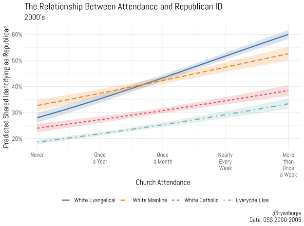 The 1990’s are when the convergence between the two Protestant camps finally happens – white evangelicals at all attendance levels are now significantly more Republican. Among the never attenders, Republican ID jumped about seven points, but at the top end it was much larger (around thirteen percentage points growth over the 80s). But, the mainline Protestant line also shifts more Republican on the low attending side of the graph a few points as well. So this is not a case of mainline Protestants becoming less Republican, the distance between Catholics and evangelicals was shrinking because of evangelicals shifting significantly to the right. At the same time, the white Catholic line now begins to pitch upward – the more religiously active, the greater likelihood of identifying as a Republican.