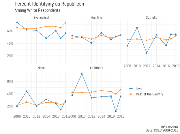 The religious composition of the parties differs in 2018, but how has this been changing across the last decade? Are the parties polarizing on religion in Iowa? It doesn’t look like it. The figure below shows Republican identification for each religious tradition from 2008-2018. White evangelicals have been creeping slowly less Republican across this decade, with a bump up in 2016, followed by a bit of decline. That stands in contrast to the nation, where white evangelicals have been getting more Republican across this time. Since this just includes whites, we cannot chalk up this movement to growing numbers of Latino evangelicals. Other groups have bobbled around (most likely due to small sample sizes), but on the whole haven’t changed much in the last decade.