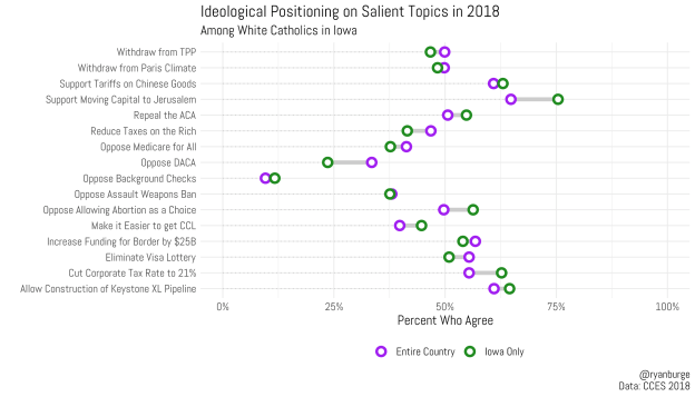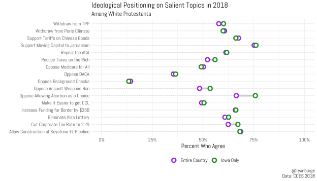 If evangelicals are becoming less Republican, does that mean that their issue positions are distinctive? Mostly not. They look about the same as their national counterparts. They want to withdraw from all sorts of international cooperation, repeal the ACA, reduce taxes on the rich, and move the US embassy in Israel to Jerusalem. The few notable gaps with national evangelicals are on guns, corporate tax rates, and abortion – Iowan evangelicals are more conservative than others.