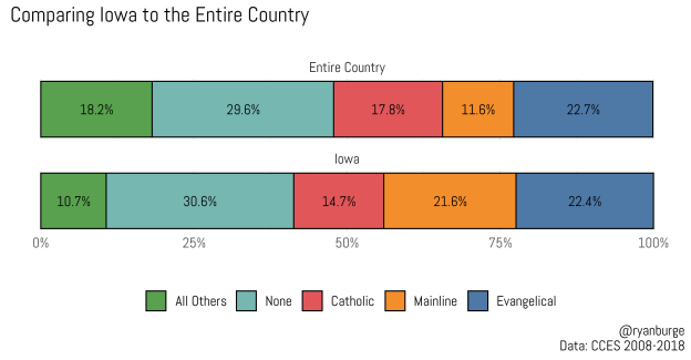 The first formal contest of the 2020 nomination process kicks off Monday as citizens across the rolling hills of corn in Iowa meet in precinct caucuses to select delegates. Obviously it is a distinctive state, with little resemblance to the nation, but few talk about the religious distributions of “Iowegians”. Iowa has little racial diversity – it’s 93% white compared to 75% nationally, but what about the religion of its residents? We thought we would cover this ground to round out the picture of the state that Illinoisans have long joked doesn’t actually exist.
