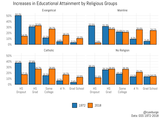 Before getting into politics, it’s important to get a good sense of just how much education has accelerated in this country among different religious groups. I calculated the share of the three major Christian traditions (evangelical, mainline, and Catholic) as well as the “nones” at each level of education in both 1972 (the first year of the GSS), and 2018.