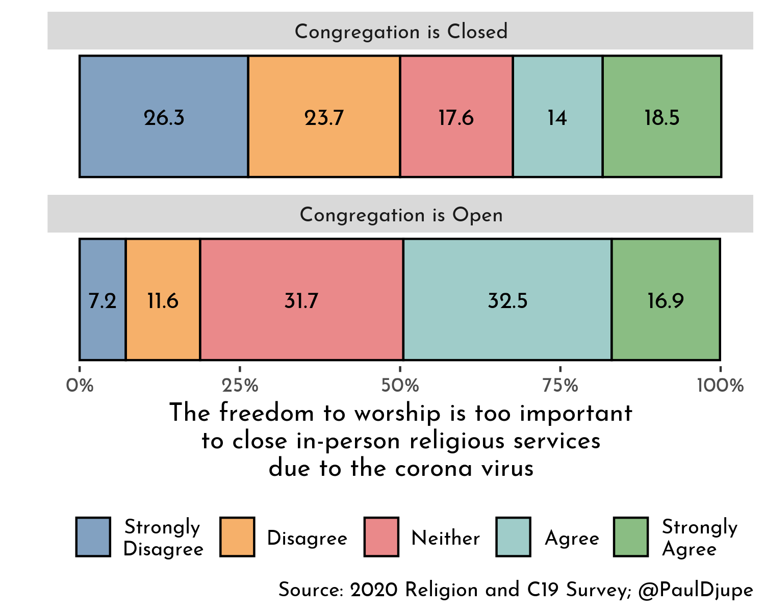There are multiple dimensions on which to think about the tension between public health and corporate worship, but perhaps the most salient, especially for Americans, is when a social good bumps up against their rights. We asked about this directly, “The freedom to worship is too important to close in-person religious services due to the coronavirus.” The results visualized below show a hardened position by those who reported their congregation to be still open. Less than 20 percent of them disagree with this position and a bare majority agrees (or strongly agrees). Contrast that with the 32 percent of those whose congregations are closed who agree with the rights position.