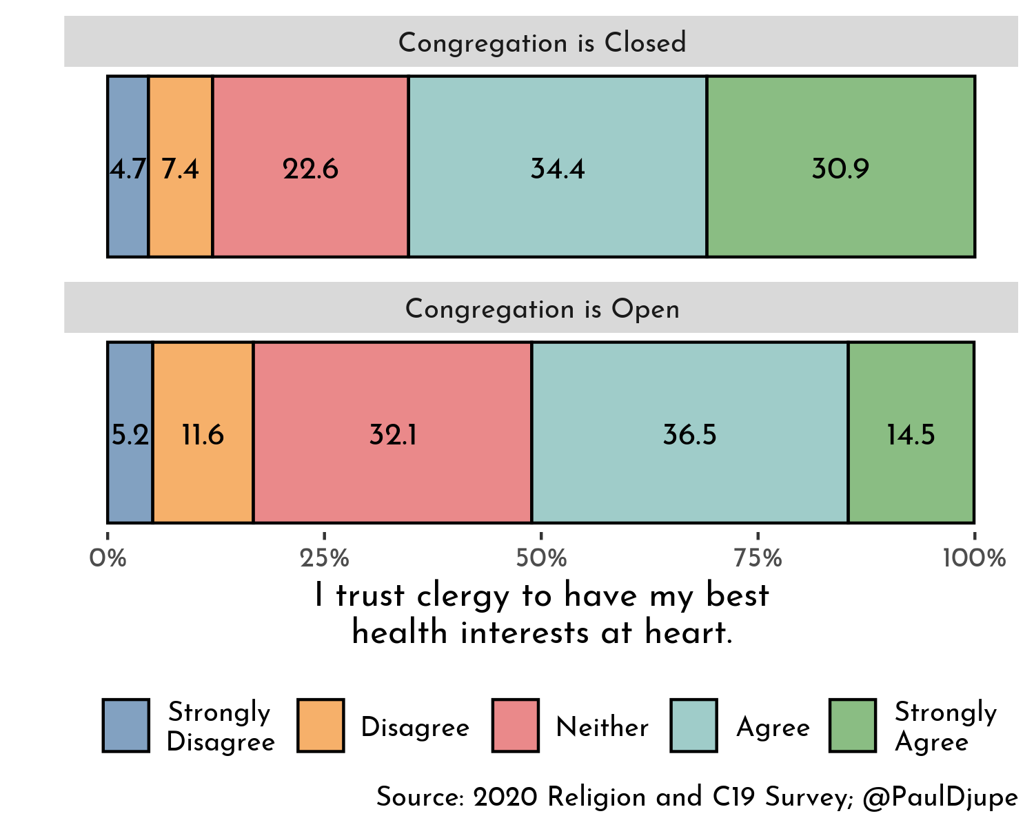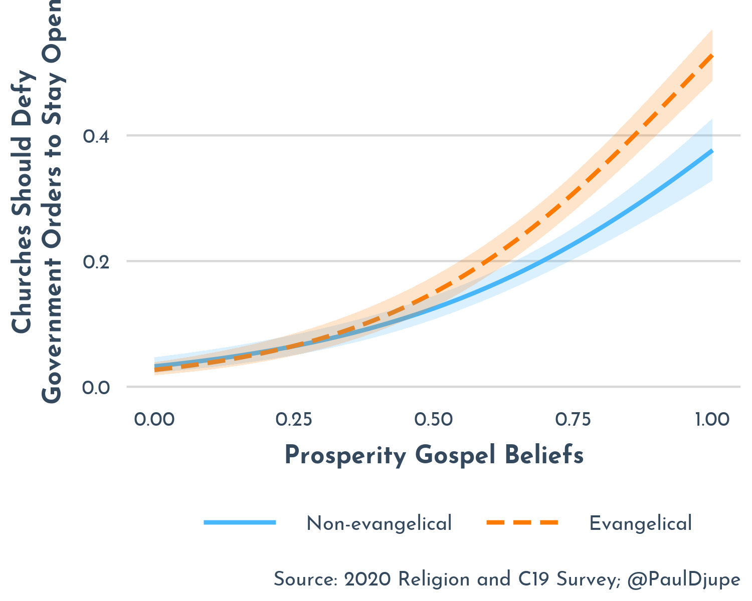 Rights are not the only reason people may support congregations remaining open. Some trust their clergy “to have my best health interests at heart,” but in this case, those whose congregations are closed were about 14 percentage points more likely to agree (see the figure below). Therefore, demonstrable action in the health interests of congregants shows up in beliefs about clergy’s intentions. However, that is counterbalanced by religious beliefs that invest religious faith with healing powers. Stronger prosperity gospel beliefs drive up both the belief that clergy have their best health interests at heart as well as the position that congregations need to remain open despite the coronavirus.