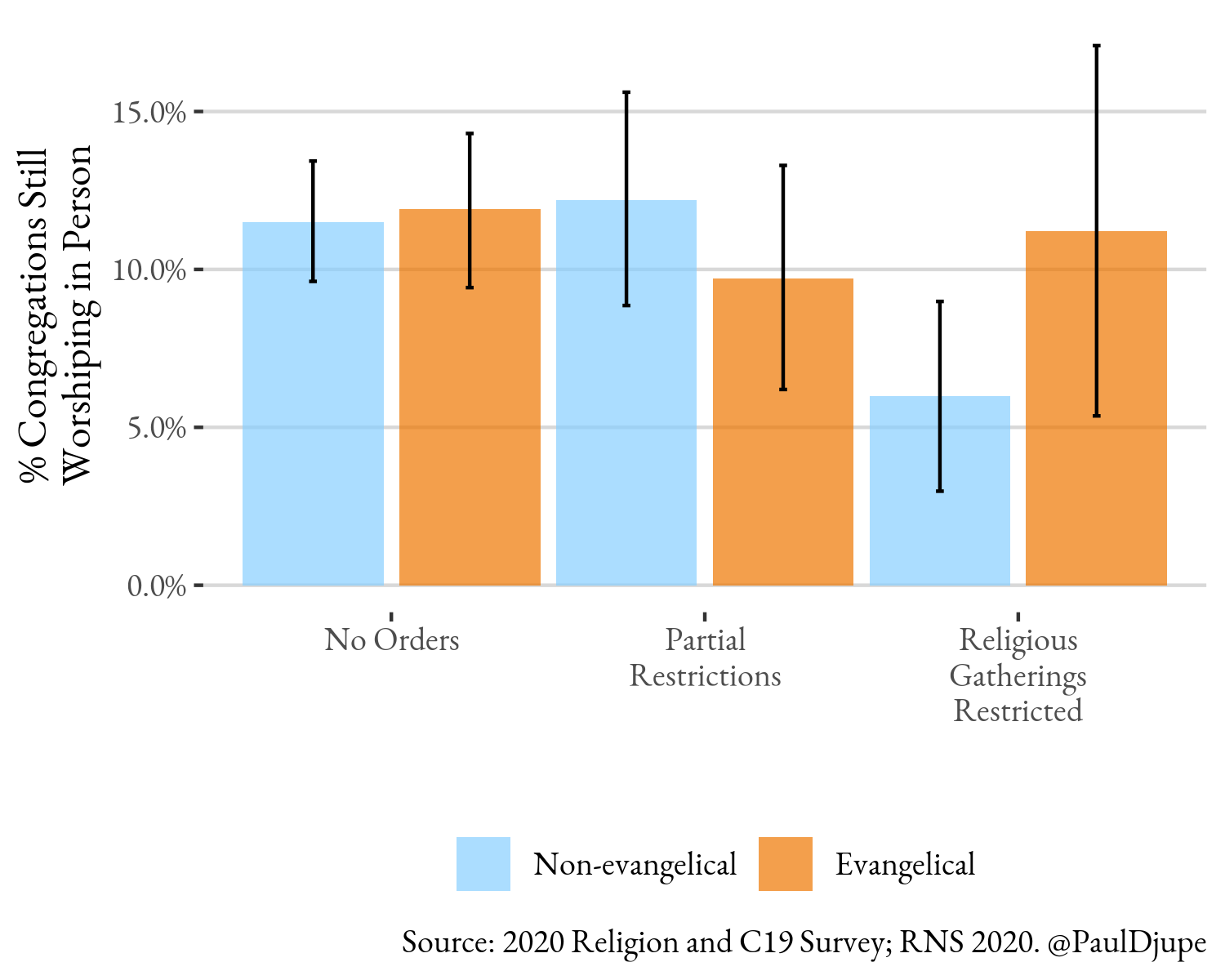 It is important to emphasize that only 12 percent of respondents report their congregations as open to in-person worship at the time of the survey. And that figure does not vary much depending on the kind of state regulations faced. The one exception is that fewer non-evangelicals report their congregations to still be open for in-person worship (6 percent versus 12 percent of evangelicals) when the state does not exempt religious gatherings.