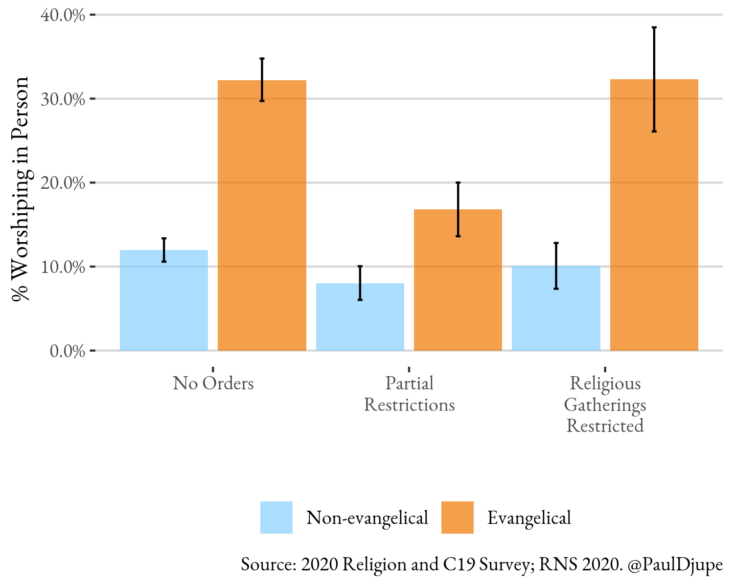 Yes, they do, and evangelicals are more likely to report worshiping in-person in states with no restrictions as well as states with religious restrictions. In both cases, almost a third of church-attending evangelicals reported attending worship in person. In states with only some religious restrictions, far fewer evangelicals report in-person worship – only 16 percent. Evangelicals’ behavior stands in contrast with non-evangelicals, among whom only about 10 percent report worshiping in person and without much variation across levels of state restrictions.