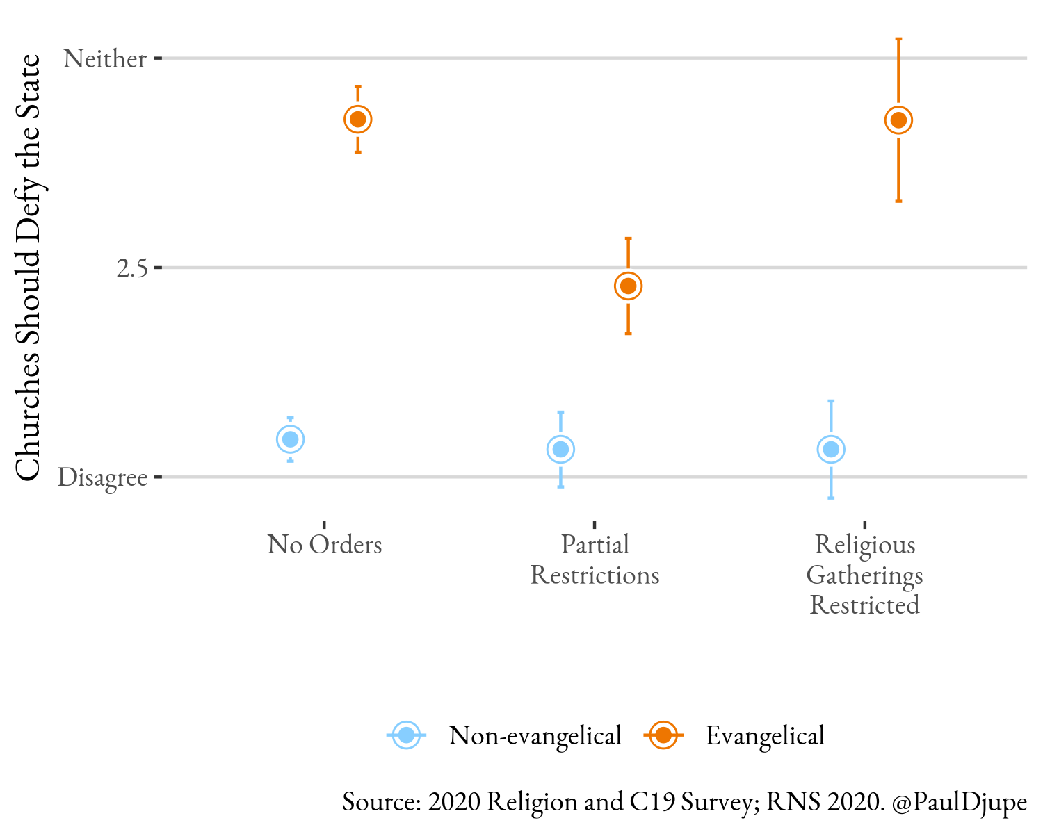 We asked one additional question that is particularly pertinent to this debate – if they agree or disagree that: “If the government tells us to stop gathering in person for worship I would want my congregation to defy the order.” Defiance is higher (by ~13%) among those with congregations still open, and is considerably higher (by 40%) among those still worshiping in person. In the figure below, I assess how this attitude is linked to state restrictions. The pattern should look familiar. Non-evangelicals reject an attitude of defiance to state orders regardless of state restrictions. However, evangelicals take a traditional, embattled stance. On balance they do not support defiance (the average is close to “neither agree nor disagree”), but defiance is much higher when the state has no restrictions and when religious gatherings are prohibited by the state. It is just under half a scale point lower (~10% lower ) when the state has partial restrictions in place. In all cases, though, evangelicals are much more supportive of defiance of the government than non-evangelicals.