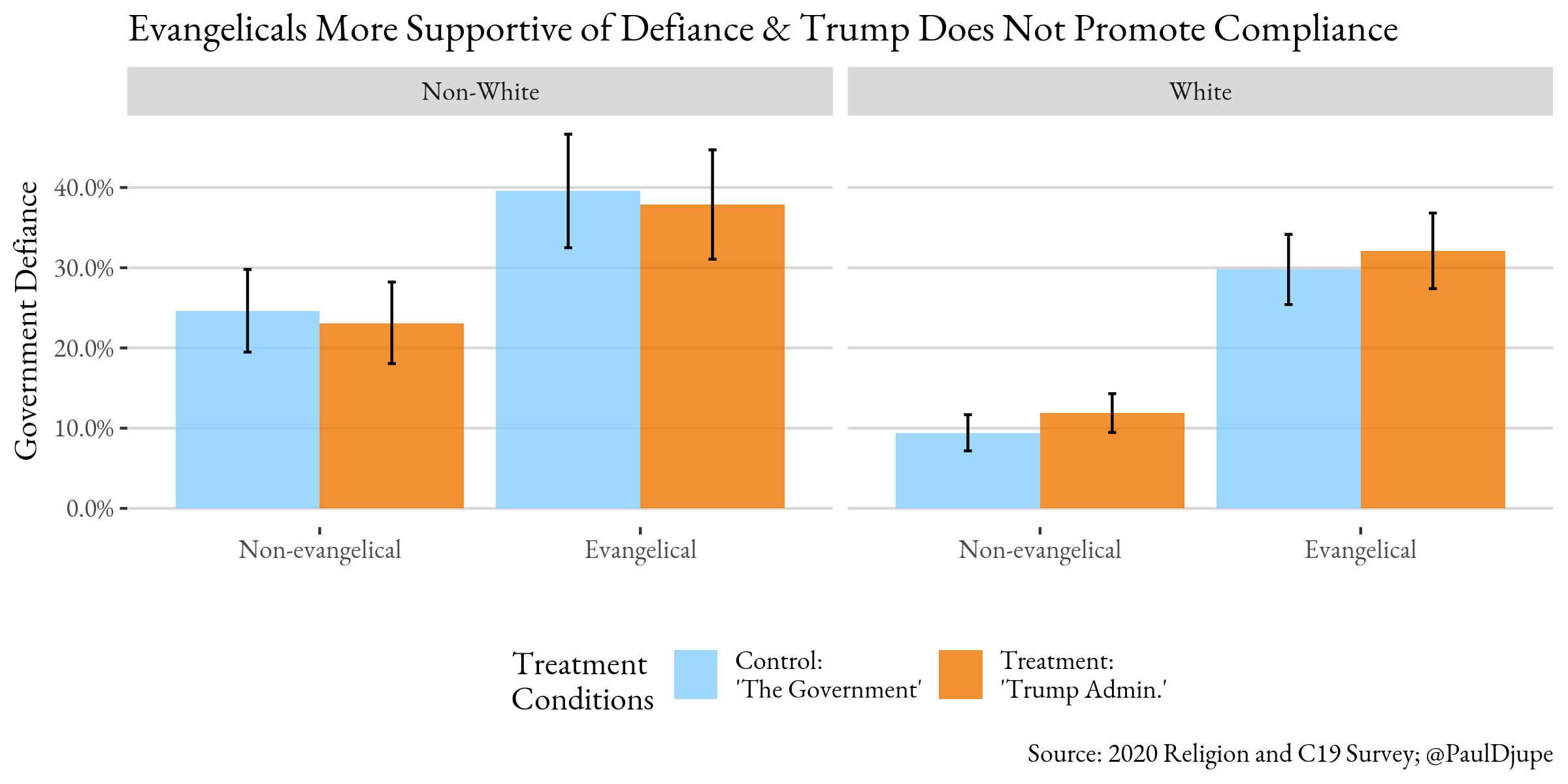 In any event, the figure also shows the effects of swapping “Trump Administration” for “the government”. It makes no difference whatsoever. There is a very slight drop in support for defiance among non-whites and a very slight rise in defiance among whites when Trump was the source of the closure order. Evangelicals within each racial group respond in the same way as non-evangelicals.