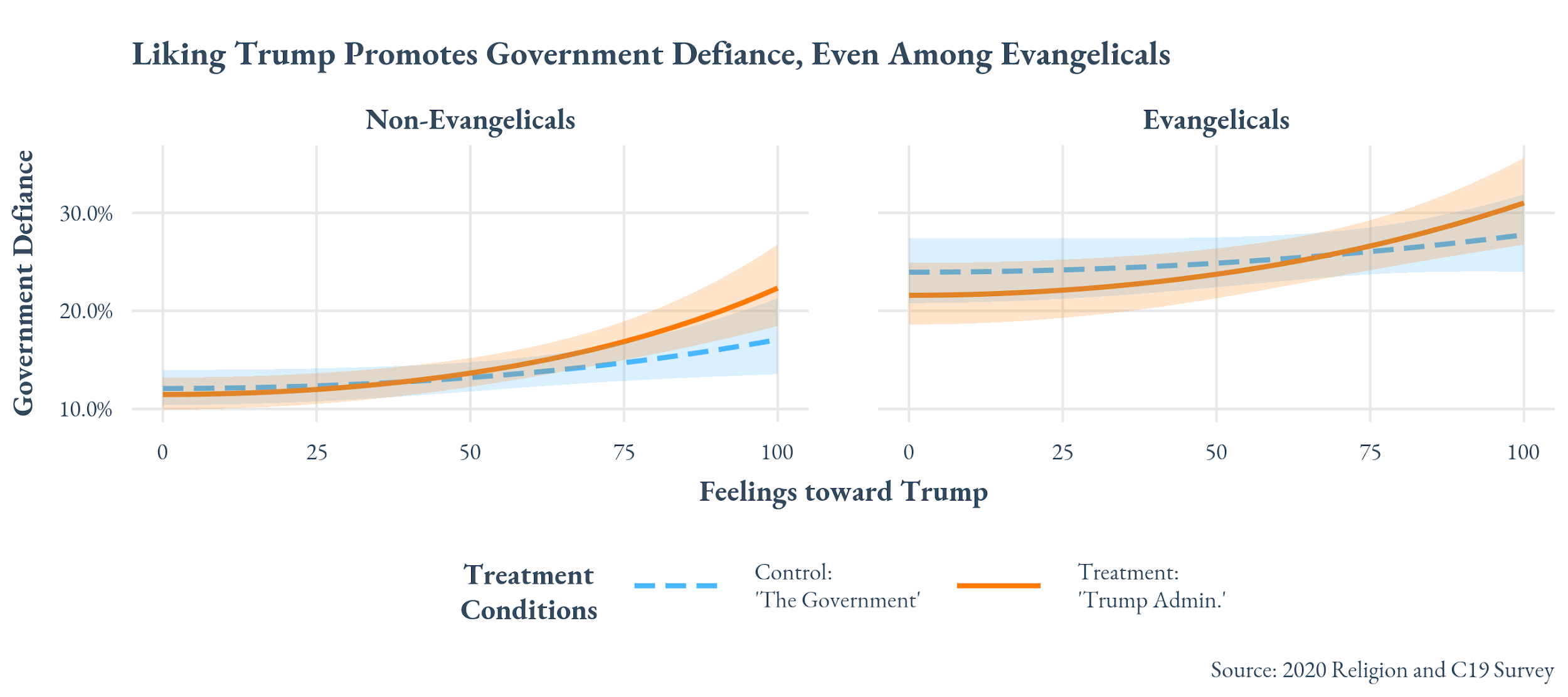 There is some variance in how much people like Trump, even among white evangelicals, so perhaps the effect of the experimental treatment works conditionally based on those feelings. The figure below shows that, if anything, seeing the “Trump Administration” boosts a desire for defiance among those who like Trump the most. Otherwise, feelings toward Trump have little bearing on defiance when “the government” is the source.