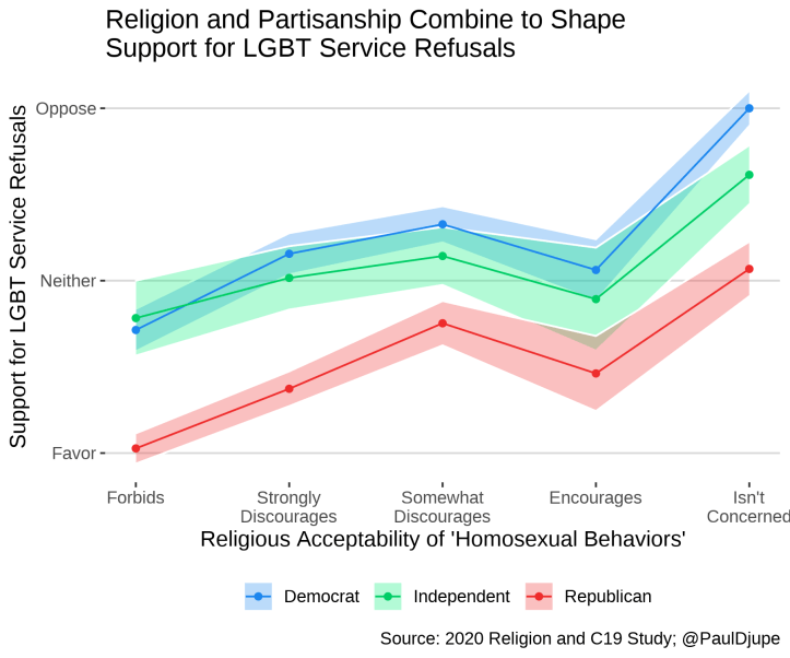 One of the important implications of the Court’s ruling in Bostock is for so-called religious freedom – the ability for businesses to refuse to offer their services to LGBT Americans because of their religiously motivated disagreement. Some elites suggested that Bostock was the end of religious freedom in the US or at least the end of legislative bargaining on the matter, though not all observers share these views. We of course have no data to address these points, but I can wade into public support for service refusals – the core behavior at issue in religious freedom cases. Do those whose religion forbids ‘homosexual behaviors’ also support service refusals? How does that compare with partisan differences?
