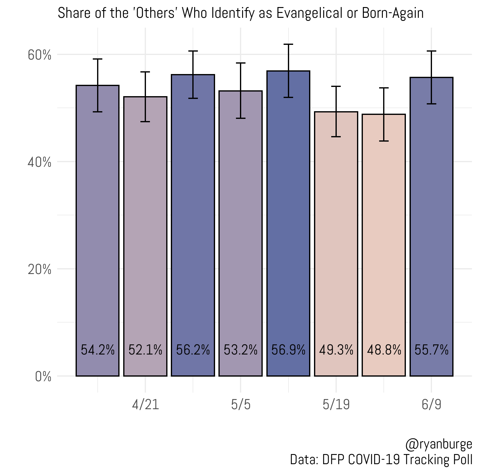 Let’s get back to those “Others”. Their numbers have grown over the last 8 weeks – who are they? One thing we know about them is that a majority of them also identify as evangelical as the following figure shows. The percentage shifts a bit over the 8 weeks, but is generally stable at just over 50 percent. If “other” is amassing ex-Protestants, then the category appears not to be taking disproportionately from evangelicals.