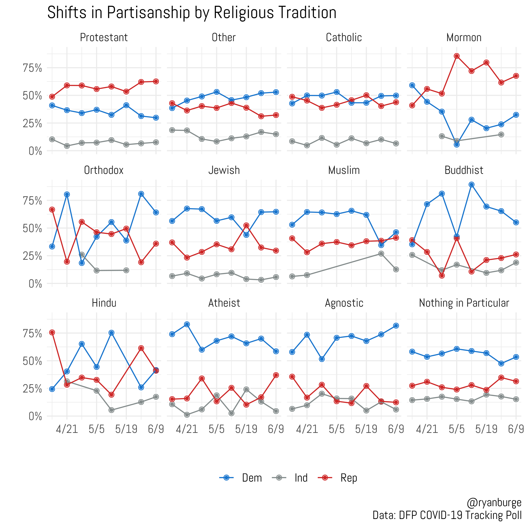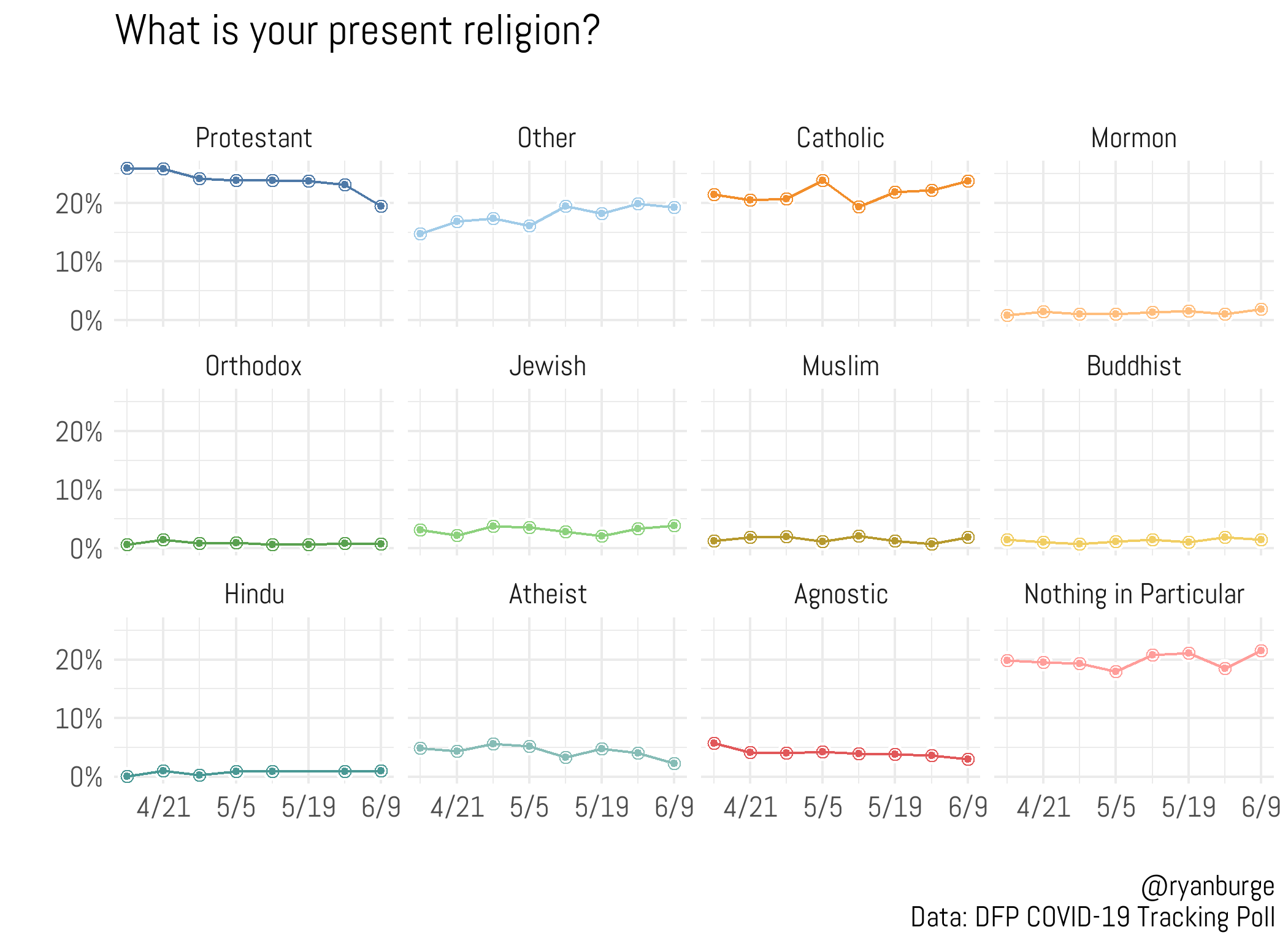We never have fine-grained tracking poll data on religion – it’s simply too expensive to ask some of the necessary questions to measure religious affiliation. So, we are tremendously fortunate that the Data for Progress have made available tracking polling data in weekly surveys beginning in April, giving us eight weeks of measurements (so far) to draw on with appropriate sample weights to ensure representativeness. Of course we need to issue caveats. First, these are samples and thus subject to sampling error. Given the sample size (N~1000 each week), we do not expect those errors to be large, but they are present (the weights take care of most of this). Second, religious identification measures like the ones we show are often the last to change. That is, when people leave a particular congregation, they often do not stop calling themselves a Protestant. Leaving a religious identity may come later – disaffiliation precedes de-identification. Of course, we need to remain cautious about making too much of any dip in a weekly polling effort. At most, these potential trends need to be monitored further.