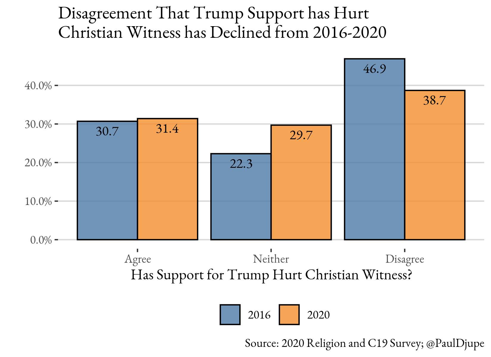 In several surveys now, I’ve asked if respondents agreed or disagreed that, “Christian support for Donald Trump has hurt Christian witness.” When Brian Calfano and I asked this in the week before the 2016 election, 47 percent of white Christians in our sample disagreed (note, the wording was slightly different – we asked whether “Public support for Donald Trump has hurt Christian witness”). When Ryan Burge and I asked it again in March 2020, disagreement had dropped to 39 percent. That does not mean that agreement has grown – it stayed the same at ~30 percent – but instead fence sitting has grown from 22 to 30 percent. Perhaps there is growing recognition that the association with Donald Trump is not doing any favors for white Christianity.