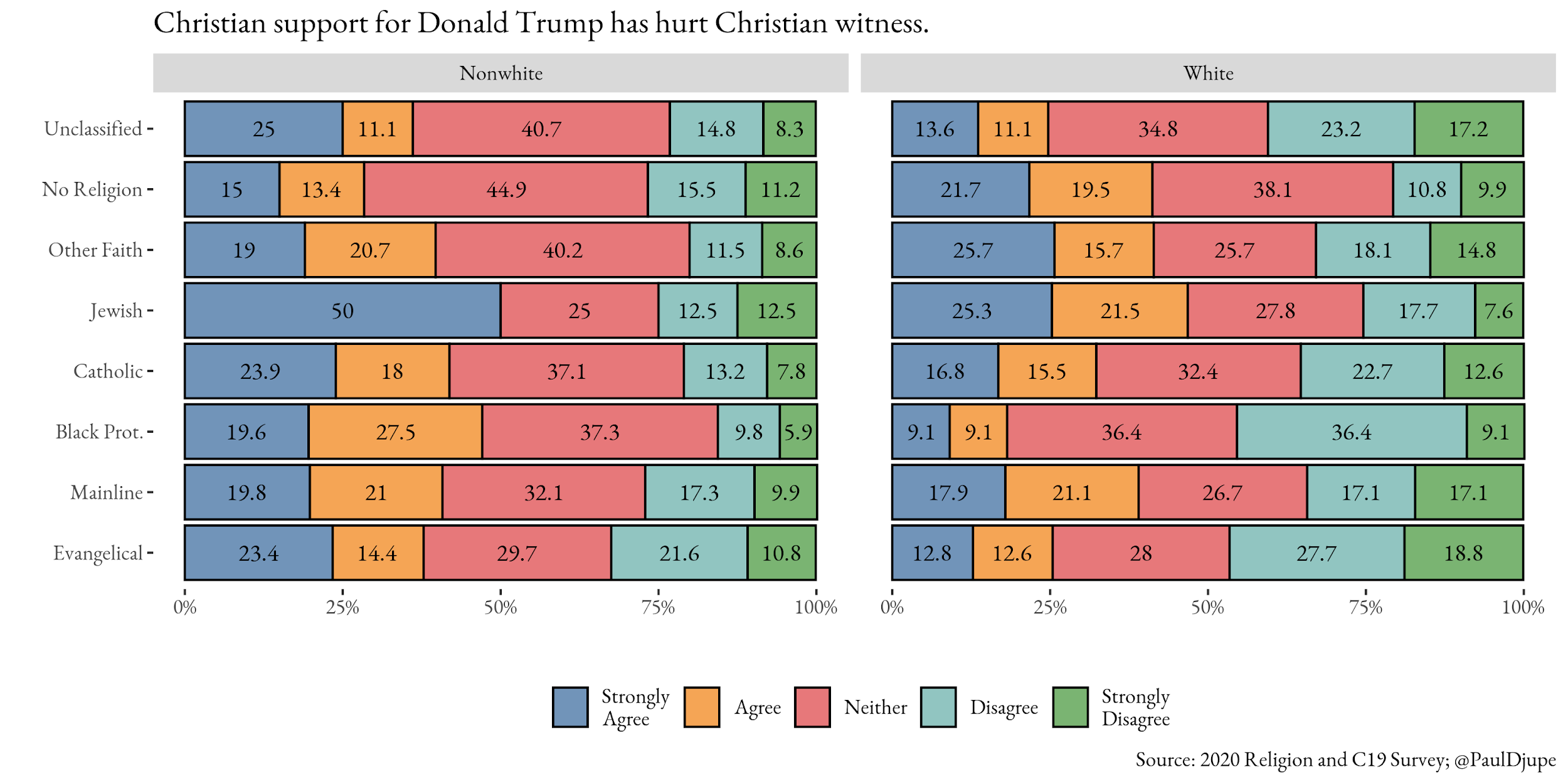 Let’s take a look at how views about Christian witness vary by religious tradition (and race). In the figure below, it is notable that nonwhites from each religious tradition are more likely to think that support for Trump has hurt Christian witness, but there is nothing close to unity in any group. Within racial groupings, evangelicals are more likely to disagree with this statement, but it is not a majority view (close though). The consistently largest single response category is neither.