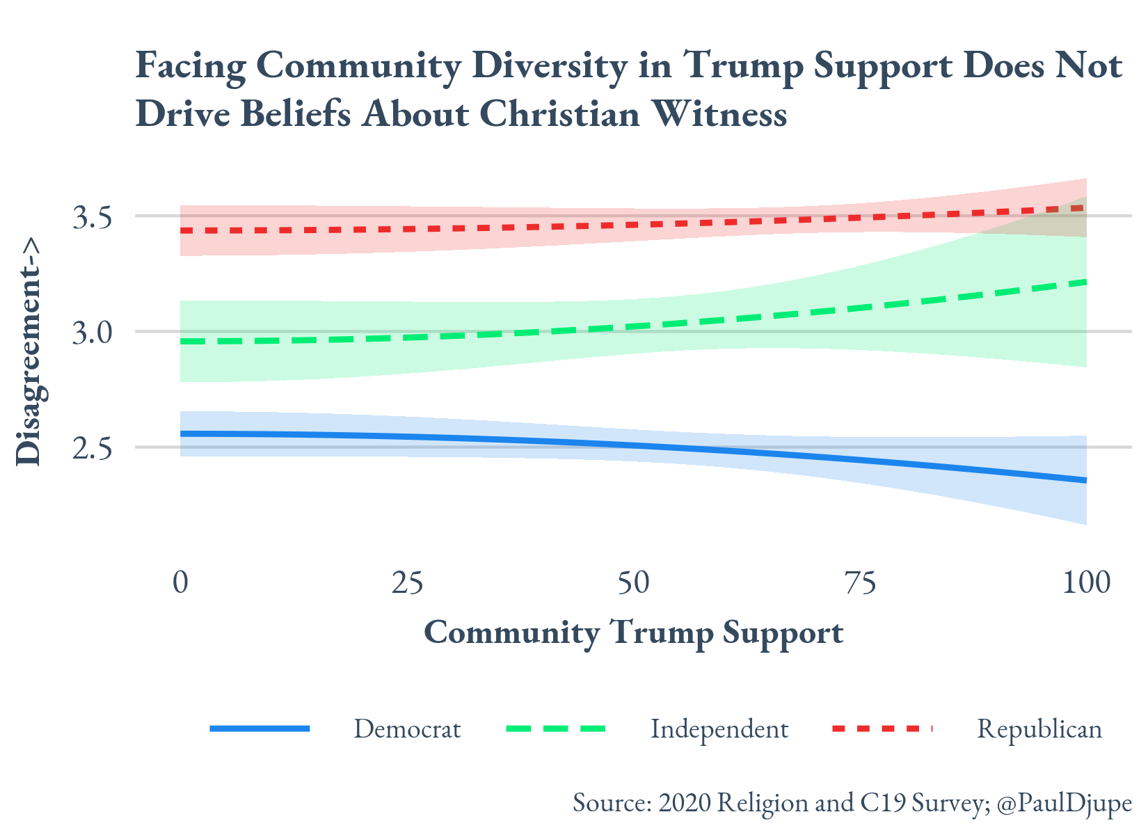 The following figure shows that perceived Trump support in the community has no bearing on how white Christians answered the Christian witness question. Republicans were consistently more likely to disagree that witness has been damaged, while Democrats were more likely to agree. And being surrounded by partisans of the other side does not matter a lick.