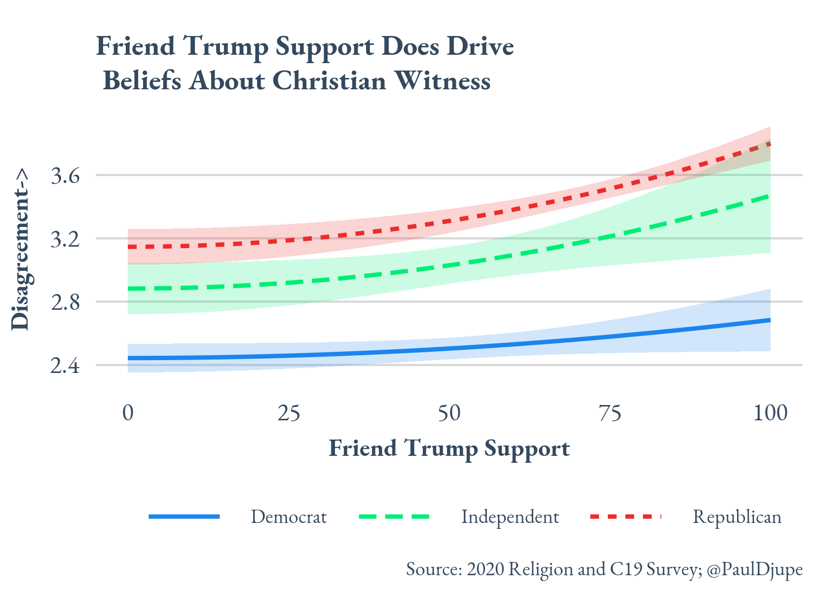 When we zoom in and ask about support for Trump among “my friends,” the picture changes. The partisan split is still there, of course, but the efficacy of Christian witness changes based on friendships. More Trump-supportive friends nudge the respondent to disagree that Christian witness has been affected. It’s especially strong for Republicans, but even Democrats show some movement in that direction. The opposite is true as well – perceiving opposition to Trump among friends leads to greater agreement that Christian witness has been damaged. Opposition to Trump among their friends puts Republicans on the fence.