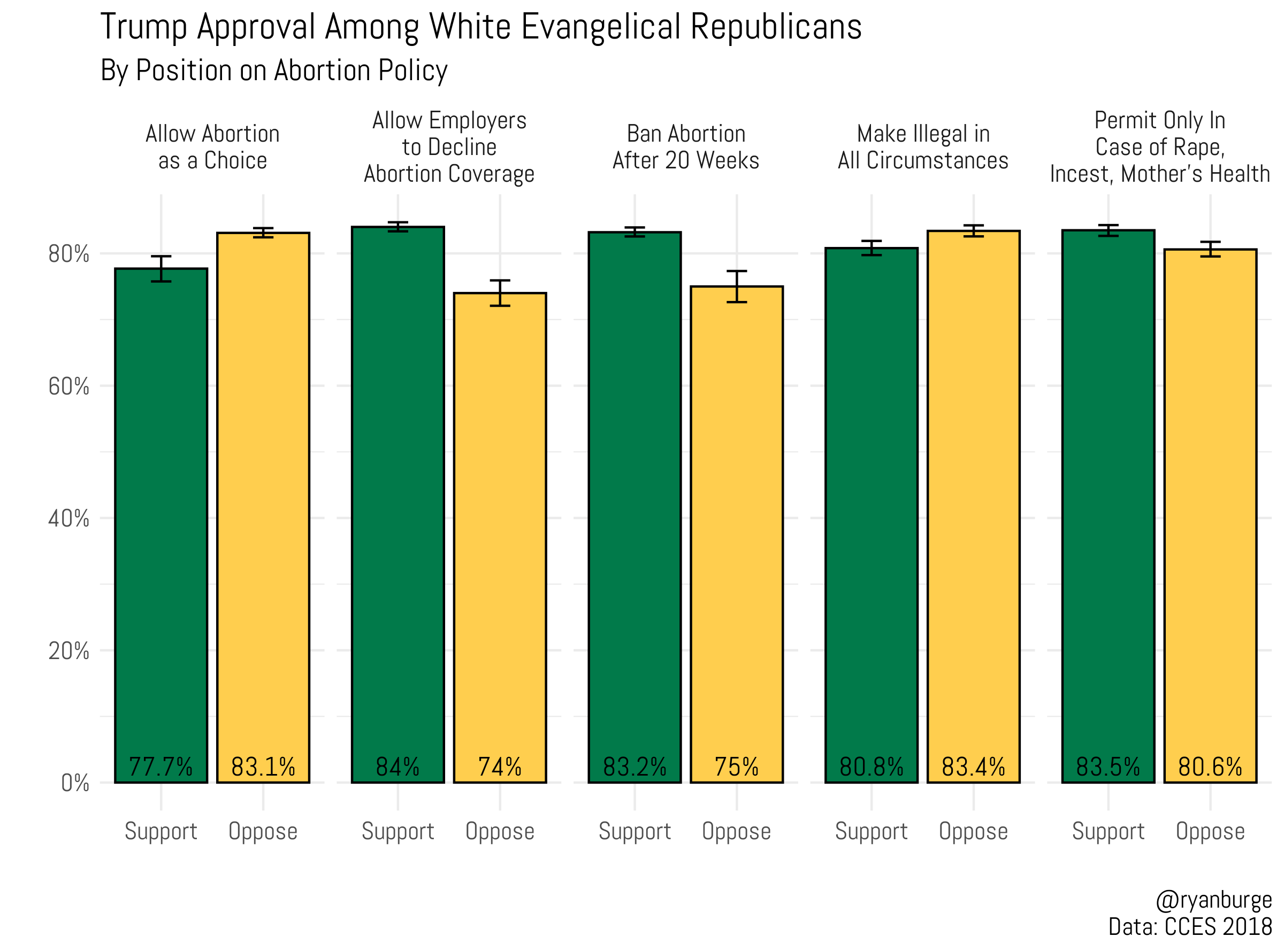 But, that’s not we see at all, really. In fact, the differences in approval of Donald Trump in 2018 were surprisingly small betweenpro-life vs. pro-choice white evangelical Republicans. For instance, 77.7% of those who support allowing abortion as a choice approve of Donald Trump, and only a slightly larger share of those who oppose abortion as a choice approve of Trump (83.1%). The gaps in approval between views of abortion are never over ten percentage points, oftentimes in the five point range). White evangelical Republicans who are pro-choice like the president a lot, almost as much as those who are pro-life.