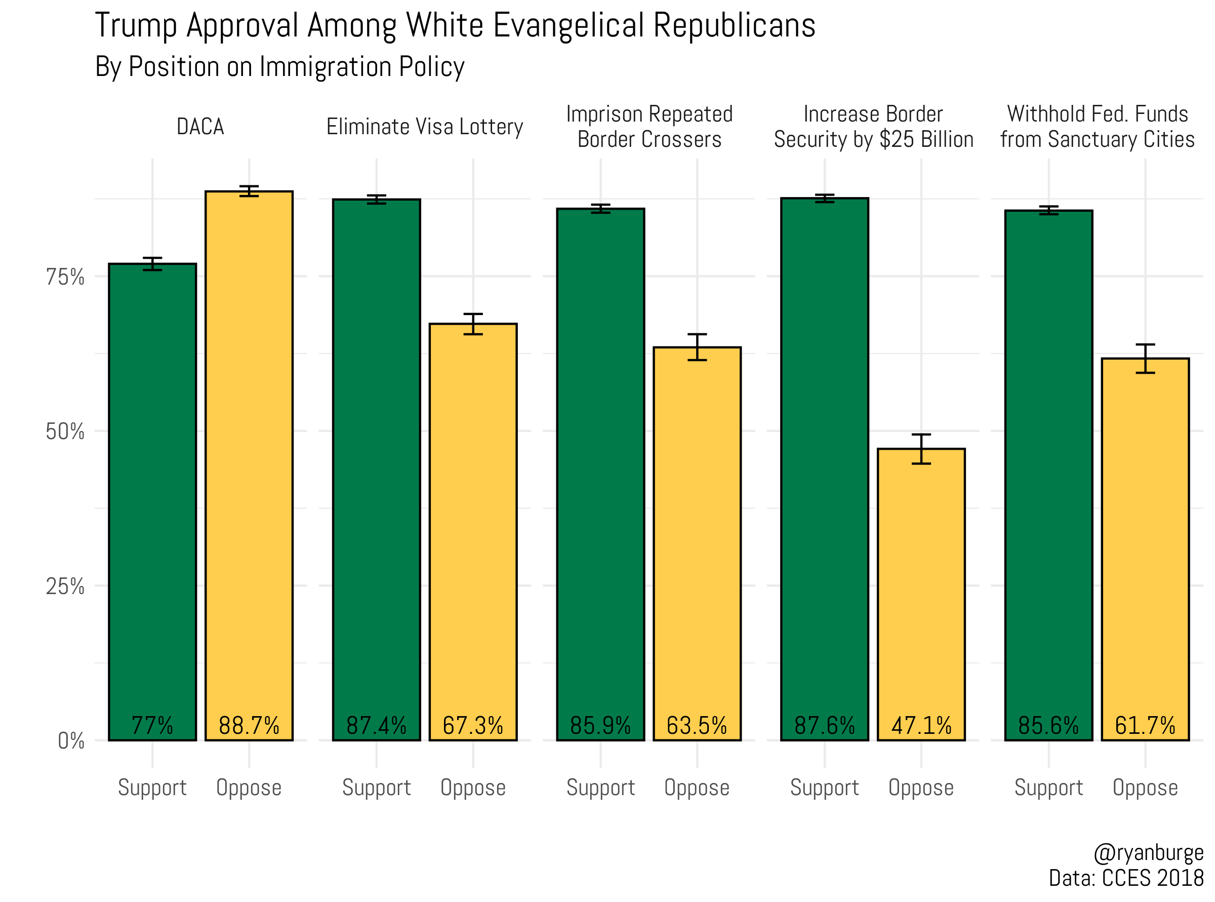 The same is not the case for those who oppose his immigration policies. Among those who are opposed to a woman’s right to choose an abortion, but want to keep the visa lottery and family based migration, the predicted approval level is 78%. Among those who are in favor of the visa lottery and also abortion on demand, predicted support is even lower (71%). Or more directly: a white evangelical Republican who doesn’t agree with Trump’s immigration policy has an average approval rating of 78%, regardless of abortion views.
