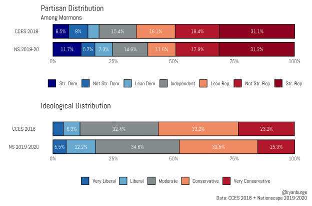 In terms of partisanship, there’s a fair amount of stability. In total the Nationscape data indicates that the share of LDS who identify as Republicans is about five points lower than the CCES sample, clearly not a big enough spread to make pronouncements about systemic change. The same is largely true for ideology – while 56% of LDS identify as conservative in the 2018 CCES, it’s eight percentage points lower in the 2019-20 Nationscape sample. The share who identify as liberal in the Nationscape is higher, too but only by about six points. Arguably nothing to write home about.
