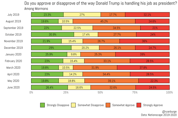 While the Nationscape is a very large dataset (total sample is over 300,000), the LDS sample is relatively small (just 1% of the entire sample, but that’s still over 3700 respondents) and thus some variation in the monthly results can be expected. But, there is one clear impression: Mormons, on balance, place Trump on the positive side of the ledger and approve of the job he has been doing. Beginning in January of 2020, the share of LDS who approve of Trump’s performance is above 50%. The overall approval rate for Trump has hovered around 42% for a very long time according to 538, so it’s fair to say that the Mormon community puts him at around ten points higher than that baseline.