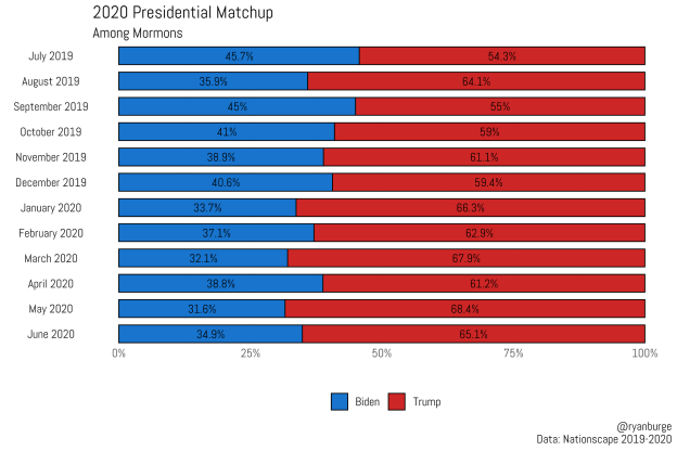 I find the LDS vote to be one of the most interesting stories of the coming election cycle. They were the only religious group that significantly shifted their vote choice from 2012 to 2016. But the circumstances surrounding 2020 are different. There are no real third party options this time, Utah is a state that has been especially hard hit by COVID-19, and Biden could be a more viable candidate than Clinton was just four years ago. The LDS vote may tell us a lot about how religious groups navigate difficult political circumstances and the limits of political partisanship.