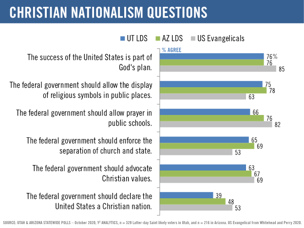 In late October 2020, at the height of the presidential election, Y2 Analytics conducted surveys in Utah and Arizona that included questions to measure Christian Nationalism, including it for the first time among significant samples of members of the Church of Jesus Christ of Latter-day Saints. Both surveys are among likely 2020 voters and contained identical questions about presidential vote choice and Christian Nationalism sentiment. Latter-day Saint likely voters subscribe to Christian Nationalism sentiments at high rates in both Utah and Arizona. In fact, as a whole they are comparable to evangelicals nationally (using data from the 2017 Baylor Religion Survey).