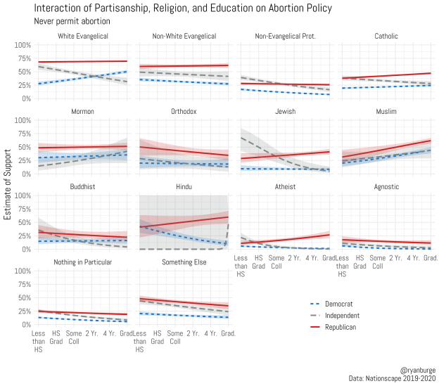 I wanted to break this down just a bit more so I specified a logit model with the “never permit abortion” question in one model and the “permit abortion anytime” question in another. I included controls for age, gender, race, and income. I wanted to see how education interacted with partisanship to shift views on abortion among the fourteen religious groups listed above. Oftentimes we would expect education may have a moderating impact on abortion as universities have ways of exposing students to both sides of an issue and to people who have different life experiences.