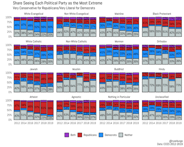 I divided the sample up into four categories: those who say that the Democrats are very liberal, those who say that the Republicans are very conservative, those who say that both things are true, and those who say that neither is true. Then, I tracked those changes across sixteen religious traditions and six survey cycles. Hi res/zoomable here.