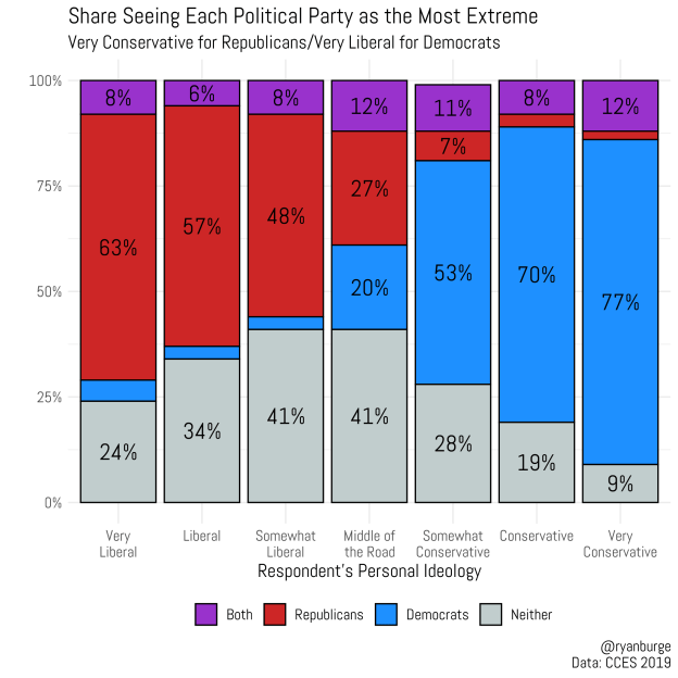 But, are views of polarization equally distributed for both conservatives and liberals? Said another way: are those on the right just as likely to see those on the left as extreme as the reverse? To answer that I did the same analysis with 2019 data and divided the sample based on how they described their personal ideology.