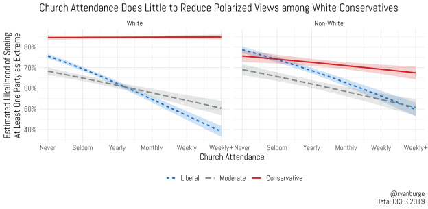 For white conservatives, their likelihood of believing that the political world is polarized is completely unfazed by church attendance. Said another way, 80% of white conservatives who never attend church see at least one political party as extreme, and that same figure is true for white conservatives who attend more than once a week.