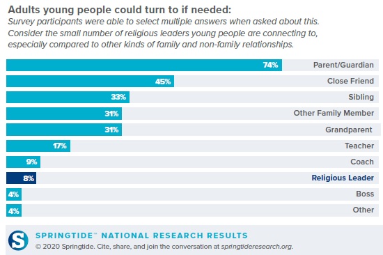 This apparent disconnect between Gen Z and organized religion may reflect on one-on-one relationships with religious leaders. At a time when young people continue to struggle with loneliness to a significant degree, just 8% of respondents say there is a religious leader they can turn to. And as the pandemic shutdowns began in Spring 2020, just 1% said a religious leader reached out to check in with them.
