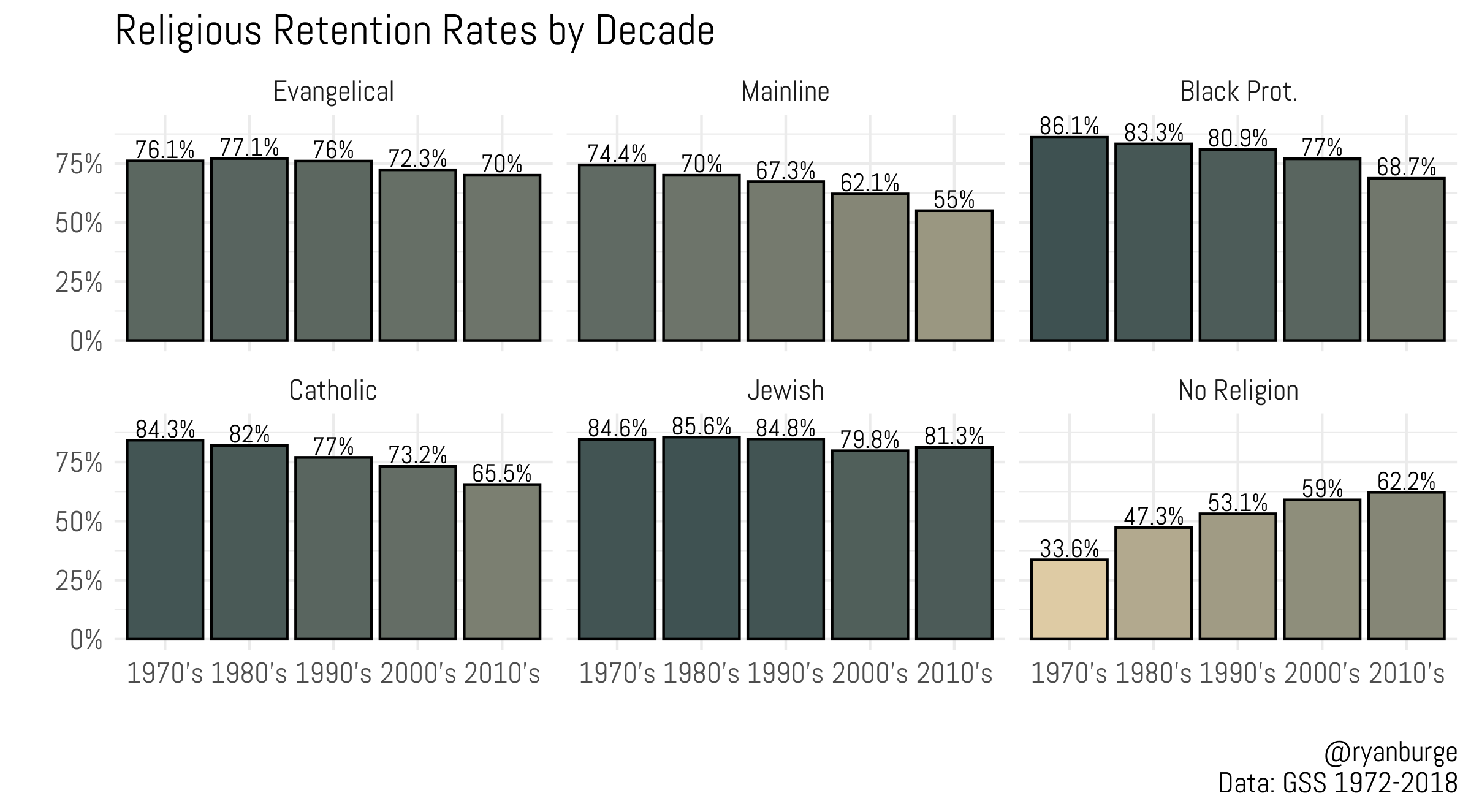 It is important to note that there are effectively no religious groups who participate in mainstream society that do not suffer membership attrition from childhood (age 16). The exvangelical phenomenon is repeated across all groups in the General Social Survey at an increasing clip. The only group that is attaining greater retention rates are the nones; in the 1970s, the vast majority of those raised as nones found religion at some point. However, by 2018, a strong majority (62%) raised non-religious are staying that way. Compared to other groups, evangelicalism is doing well. If mainline Protestant and Catholic retention rates have dipped 20 percent since the 1970s, retention has only dipped 5 points among evangelicals so they are retaining 70 percent. Jews have only lost 3 percent.