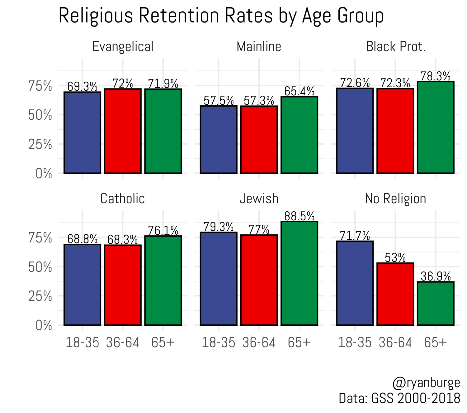 We should note that this includes all identifiers, so the retention rate among the youngest is lower – but surprisingly not by much. The following figure shows this for the same religious traditions used above. For each religious tradition, the retention rate indeed is lower for younger adherents, but only 3 percent less in the case of evangelicalism – retention questions are hitting them consistently across generations. Only for the non-religious is the retention rate inverted so the young have the highest rate of remaining non-religious when raised so.
