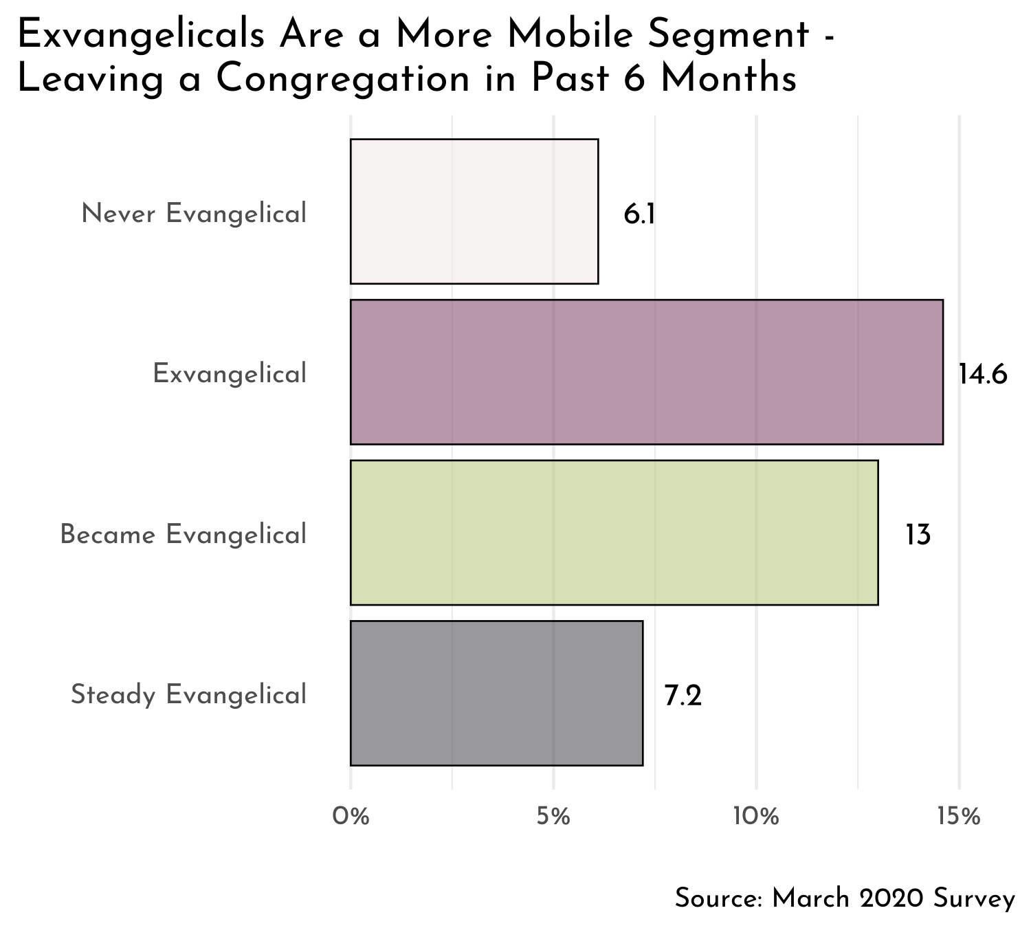 Long ago by now, the old ethnic, geographic, and other barriers holding people in religious place began to fade in what is called the “decline of denominationalism.” They left family churches and began to shop for a new church home. As I put it 21 years ago, once brand loyalty in one domain is lost, it is likely to have cascading effects so switching is common across domains. Once put in motion, people are more likely to remain so. That’s what the figure shows – exvangelicals were twice as likely to say in March 2020 that they’ve left a congregation they were attending in the Fall of 2019 (compared to the rate for steady evangelicals). Notably, this goes both ways, so those changing their religious identity to evangelical from something else were also switchers at a relatively high rate. It is also interesting to see that the average rate looks similar to what we’ve found before over short time spans – 10-15 percent are switching on the regular.