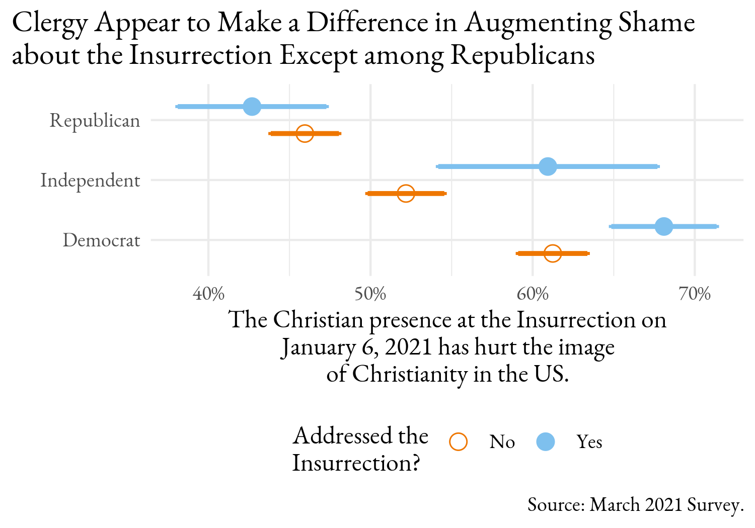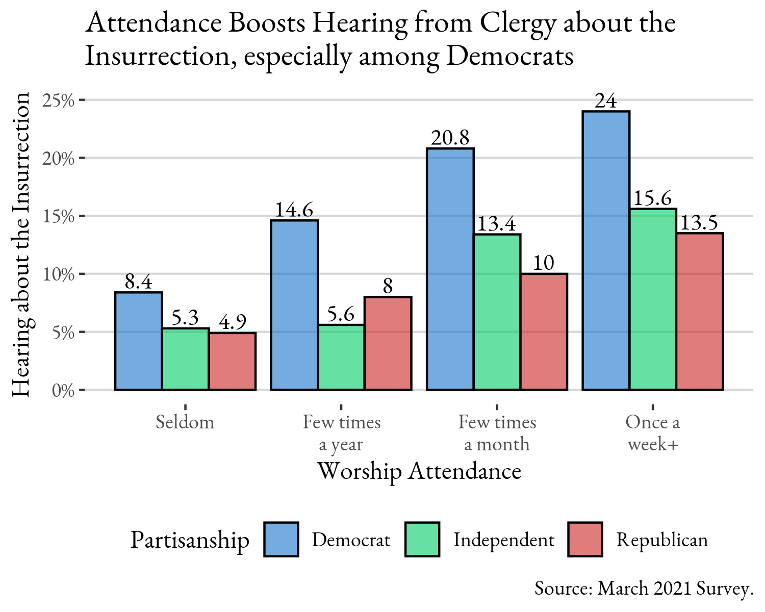 We asked a few questions that will help with this inquiry, the most important of which is whether any respondent who reported attending worship services more often than never had heard their clergy address “The January 6 Insurrection (attack on the Capitol)” in the past few months. Among that part of the sample (72% reported attending worship more often than never), 13 percent reported hearing their clergy talk about the Insurrection. Not everyone attends every week of course, so some people have more opportunities to hear their clergy as the figure below shows. But it didn’t increase at the same rate for all partisans. It is likely more clergy were talking about the Insurrection as 19 percent of weekly attenders reported hearing about it compared to only 6 percent of those who attend a few times a year, on average. But the rate from seldom to weekly attending Democrats goes from 8 to 24 percent compared to a rise from 5 to 13.5 percent for Republicans. Regardless, these figures are not high.