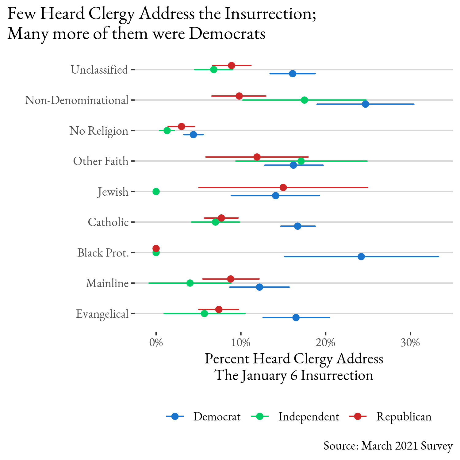 I collected data about this in March of 2021 with Jason Adkins (Morehead State University) and Jake Neiheisel (SUNY, Buffalo) several months after the Insurrection, which is perhaps ideal since it gave time for people to hear their clergy address it but was also not so long a period that they would be likely to forget. We collected about 3,550 respondents through the panel provider Lucid. This is not a probability sample, but we applied raking weights to make the sample look representative of the nation on gender, race, education, and age.
