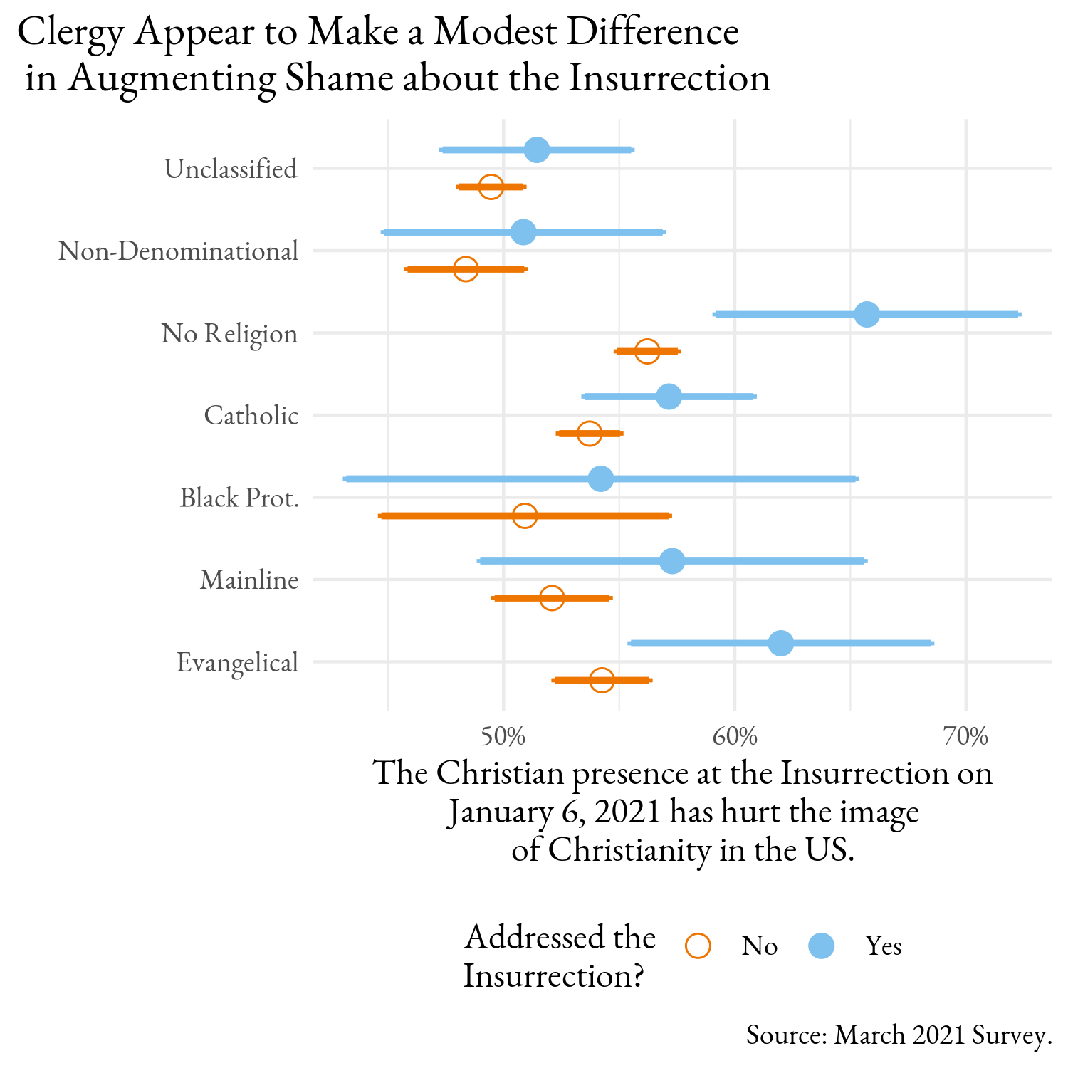 That leaves me wondering how the results add up for religious traditions. The problem with the analysis is that even with this large sample we’re running into quite small categories, which means it’s hard to tell statistically if there’s a difference between groups. Still, the results are below and show a consistent difference for those who heard from their clergy (the results come from a statistical model with controls for demographics and partisanship in recognition that Democrats were more likely to hear about this). The religious nones (yes, a decent chunk say they attend worship services) were the only group to register a statistically significant increase in views that the Christian image was hurt by the Insurrection due to their clergy addressing it. But the other one that is close to statistical significance is interesting: evangelicals (coded by their denominational affiliation, to be clear). Part of that movement is due to Democrats moving, but there had to be some others too.