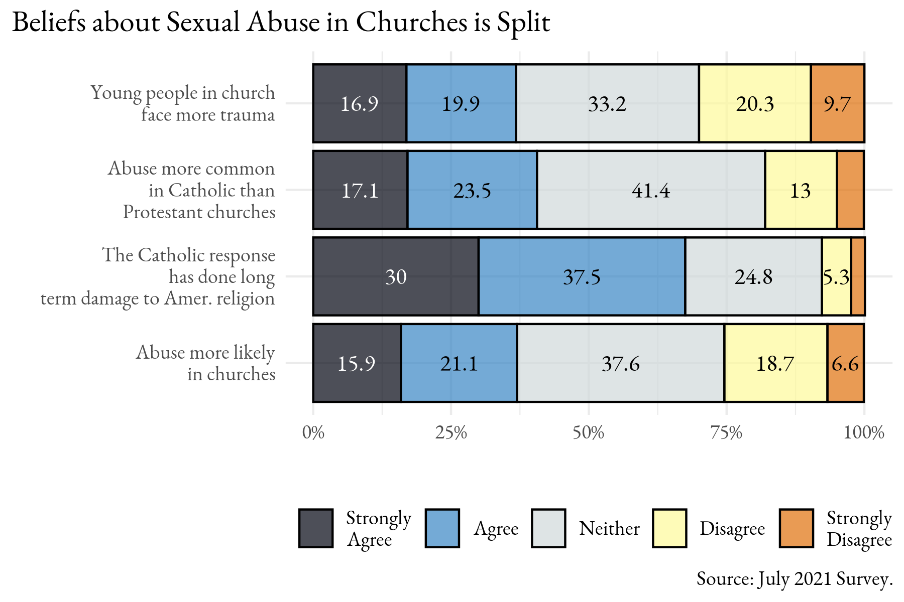 We are particularly interested to see if Protestants, especially evangelicals, believed in their own exceptionalism – that sexual abuse simply didn’t happen in Protestant churches. The steady accumulation of evidence of scandals across American religion should speak to the contrary, but they have not hit a denomination-level organization like it had the Catholic Church. In the population, 40 percent believe that the Catholic Church is unique and just as many just don’t know. But there is much more agreement (67 percent) that the Catholic response to the sexual abuse crisis has done long-term damage to American religion.