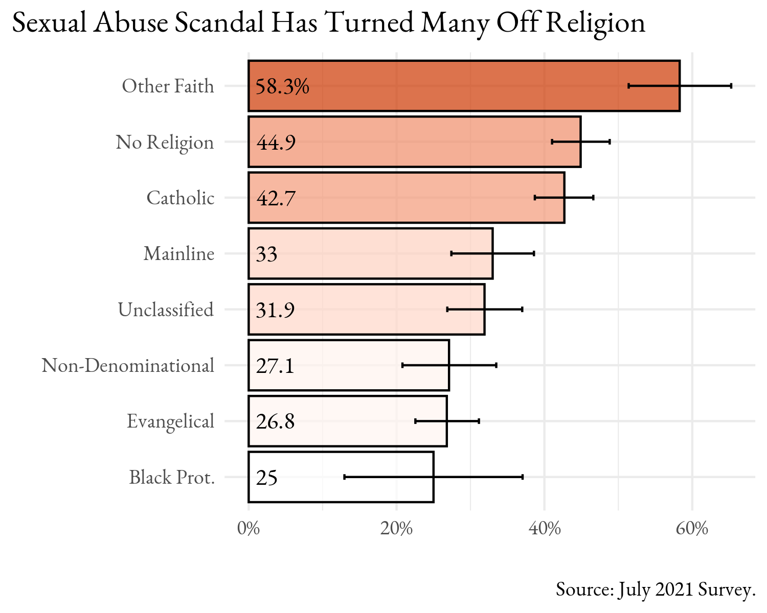 Overall, 39 percent agree that “High profile sexual misconduct by clergy has turned me off of religion.” What is interesting about that figure is that it is spread across American religion as the following figure shows. It is no surprise to see the non-religious near the top (45 percent), but trailing just behind them are Catholics (42 percent). Fully 27 percent of evangelicals (and non-denominationals) admit that sexual abuse scandals have turned them off of religion too. No religious tradition has less than a quarter of its membership turned off by abuse. That is a massive number of people affected, which is perhaps the only appropriate response.