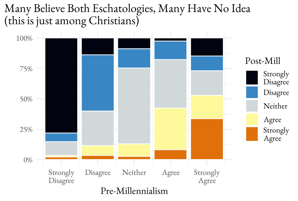 It’s not that individuals maintain a tight tether on theology. While the logic of these two statements of belief are incommensurable, a good number of Americans don’t see it that way. The following figure shows the overlap through a cross-tabulation. A majority of those who strongly agree with pre-millennialism agree (strongly or just agree) with post-millennialism. We’ve already blown the escape pod here – this is showing the results just among self-identified Christians who should know better. Clearly, there are those who disagree with millennialism of any kind, but there are not many who are consistently on one side or the other. Some readers are wondering who believes in both millennialisms and that number grows as church attendance grows – frequent attenders are more likely to believe both than non-attenders.