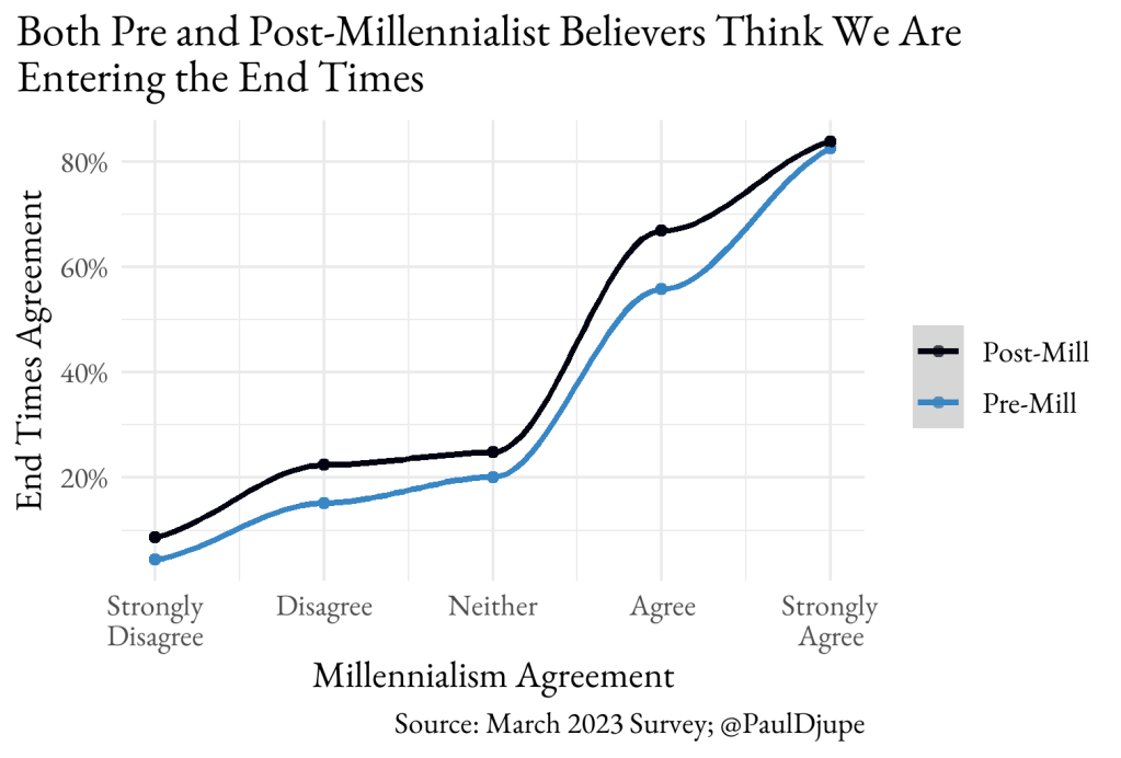 One way to assess the end of theological distinctiveness is to ask both groups about the end times. We asked a few questions, but will look at this one here: “The chaos in America today is evidence that we are living in what the Bible calls ‘the end times.’” This is decidedly not a post-millennial belief, for whom there would be no chaos before Jesus returns. But the figure below shows that they believe it just as much as, and perhaps more than, pre-millennials. Just over 80 percent of post and pre-millennialists believe we are now entering the end times.