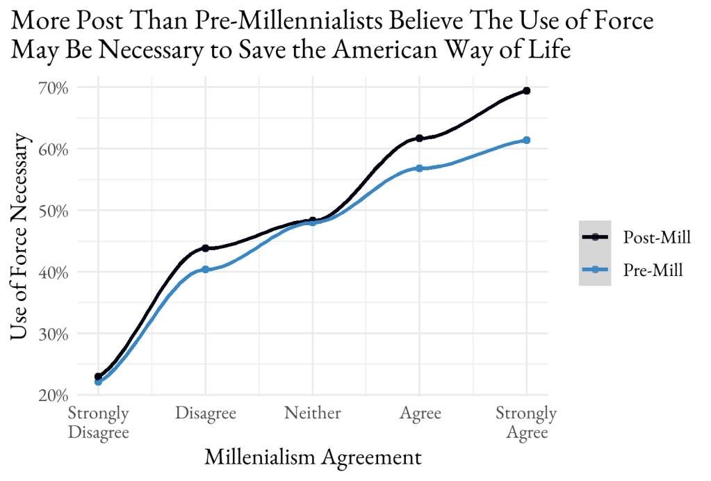 Millennialists are far from apathetic from other perspectives, as well. We asked, “The final battle between good and evil is upon us and we must stand with the full armor of God.” Those who agree with either millennialist thought are highly likely to agree. While that armor may be considered to be spiritual armor, further questions make it clear that the metaphor has spilled over into material warfare.