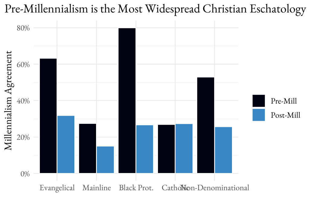 First, a quick explainer. Religions are meant to be complete. They have narratives of the beginning, rules for the middle, and stories of how it will end. Stories about the end are referred to as eschatology. There are different schools of understanding Christian eschatology that revolve around what needs to happen, if anything, before Christ’s return to triumph over evil and bring the Kingdom of Heaven to Earth for a millennium (Revelation 20). So-called pre-millennialists believe that Christ will return before fighting the final battle and then reign for a thousand years. Some believe (following the mention in 1 Thessalonians 4:17), that believers will be raptured to meet Christ in the sky before the “tribulation” times. Post-millennialists, by contrast, believe that the Kingdom of Heaven must be established here on Earth before Christ will return. Some think that millennium is still to come, while others believe that time is over and perhaps has been for a long time (the year 1000 AD brought quite the anticipation). On the other hand, amillennialists basically ignore the concept. There is a wide array of variations on each of these main schools of thought. For instance, some pre-millennialists believe that they will be made to endure a pre-rapture tribulation period. The major distinctions among Christian religious family groups can be condensed (roughly) to eschatological concerns, with Catholics being amillennialist, conservative evangelical Protestants being pre-millennials, and mainline Protestants being largely post-millennialist (or amillennialist). There’s a lot more to say here, but this is a blog post and not the book we (Andrew Lewis and Jake Neiheisel) have planned, so stay tuned for more.