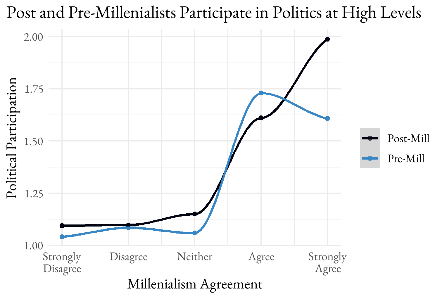 And millennialists are likely to participate in politics at high levels in these data (we find that’s true in other data, as well, using the same measures: yard signs, buttons/stickers, campaign involvement, contacting a representative, protesting, contributing money, posting a political stance on social media). There is clearly a spike of half an activity among those who agree with either post or pre-mill and strong post-millennialists participate at the highest rate.