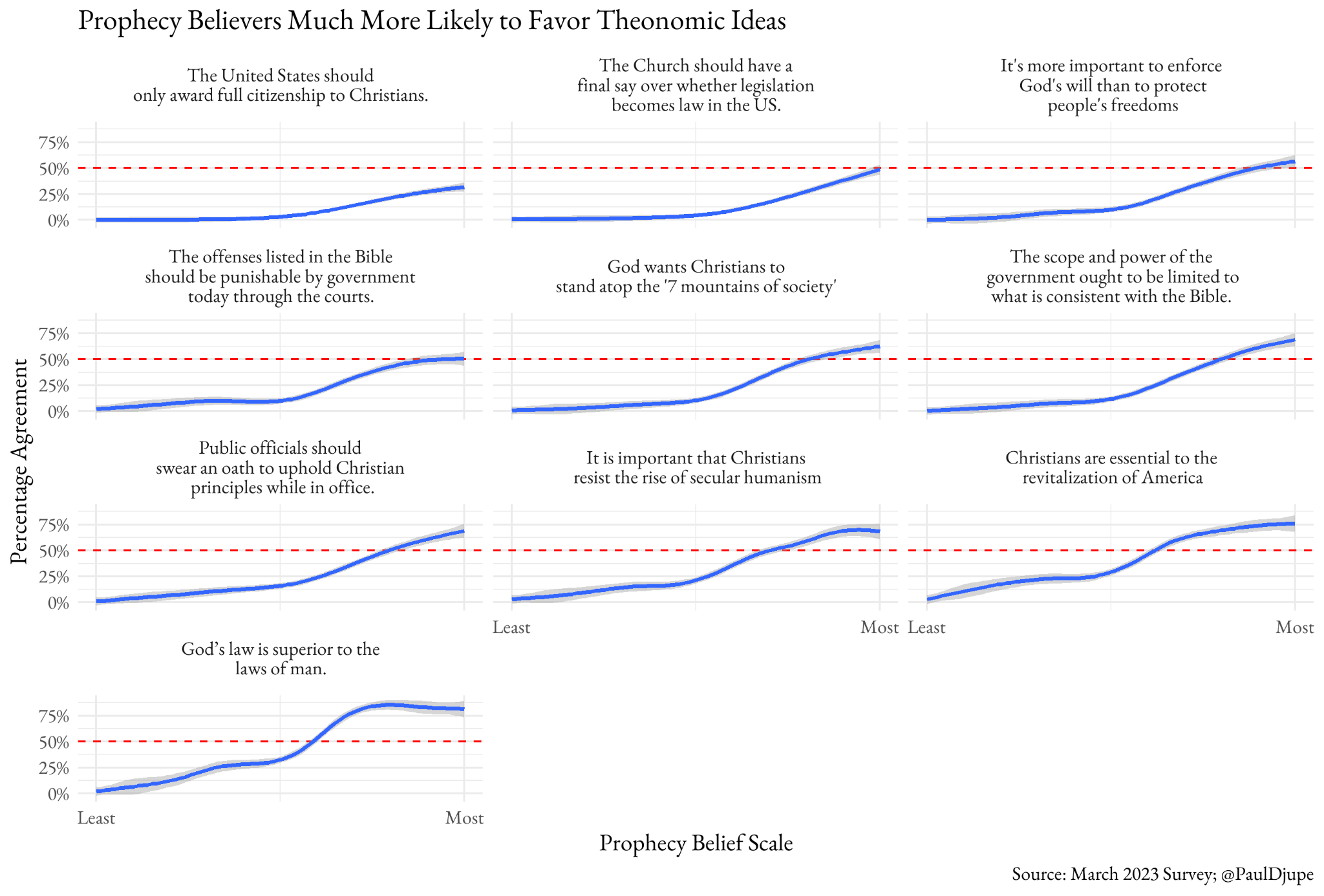 These are clearly not the only theonomic statements we could have presented (e.g., Christianity is the state religion; atheism is “crushed”, etc.), and the actual debates about what theonomy would entail are quite diverse. But we have good evidence here that the most ardent prophecy believers support clearly theonomic statements. They are mostly not unified on this path, but their support is much more substantial for a religious state than anyone else’s. I feel comfortable saying that the strongest prophecy believers wish the US to become governed by (their interpretation of) God’s law rather than the Constitution’s rule of law. And they would impose a set of rules and institutions respected only by some Christians onto all Americans. That is, their goal is Christian dominion over the United States.