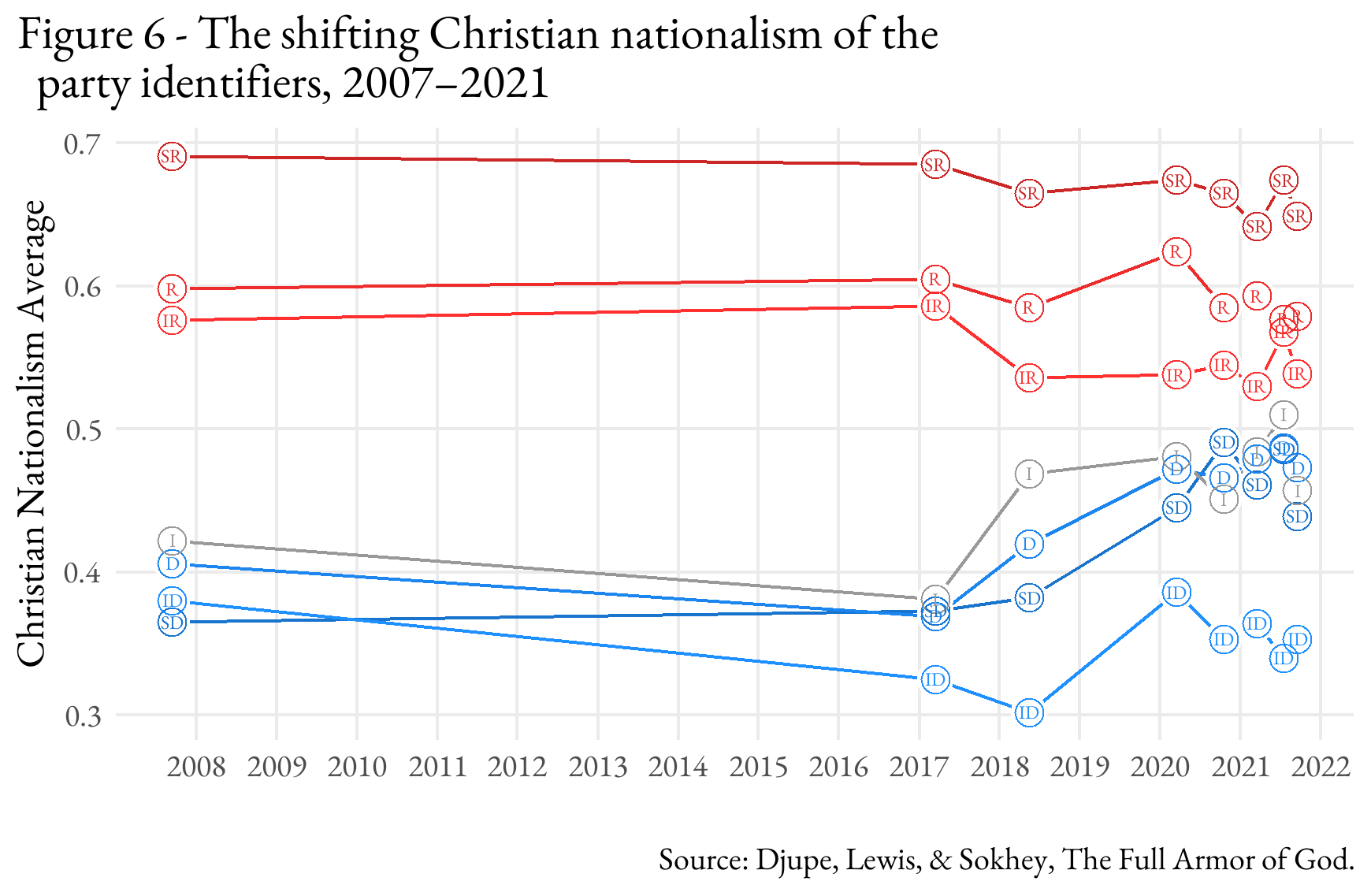 As we show in Chapter 2, a simple story of Republican Christian nationalists vying for power against secular Democrats is just a dog argument that won’t hunt. In fact, according to Baylor and our survey data (see Figure 6 below – we’re using the figure numbers from the book), Christian nationalism GREW among many Democrats during the Trump Administration. The holdout partisan category is independents who lean Democratic, mostly because of the high concentration of the non-religious in that partisan category. This helps us understand why the Democratic Party has appeared reticent to take on Christian nationalism as the threat to democracy that it is – such an argument may alienate a large portion of their identifiers.