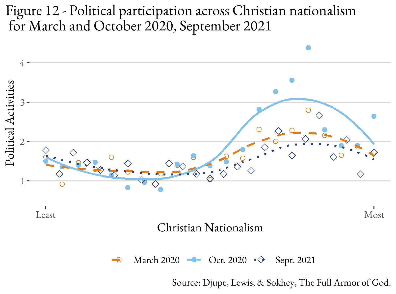 Christian nationalists were being explicitly mobilized to win elections and influence government, as Figure 12 below shows. In each of three surveys conducted around the 2020 election, those who score higher on the Christian nationalism scale participate in political activities at substantially higher levels. And that increase hit a fever pitch in October 2020 when they participated in twice the number of activities as the least CN. We are not content to leave it at that and one of the features of our book is a focus on mechanisms of influence.