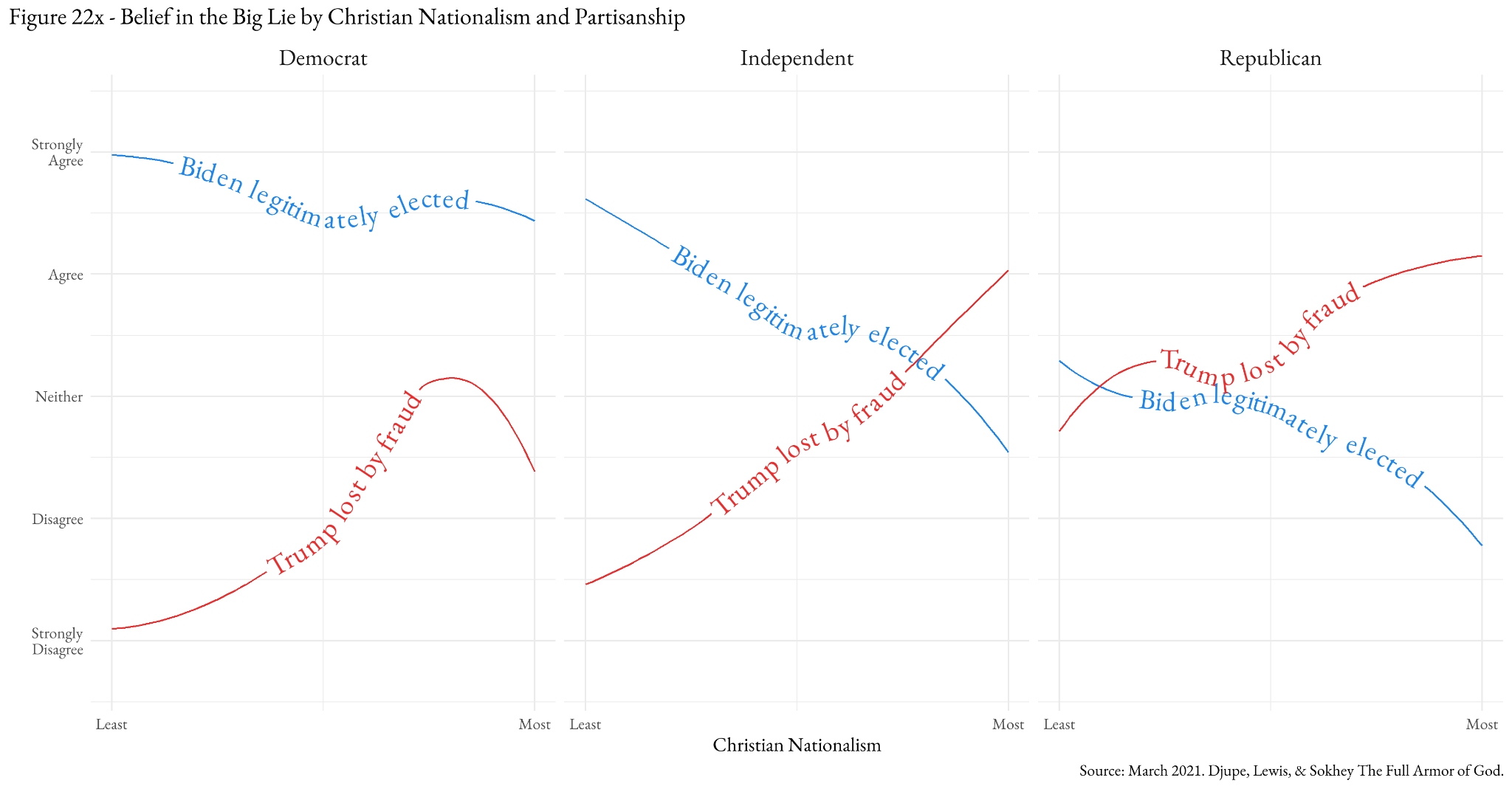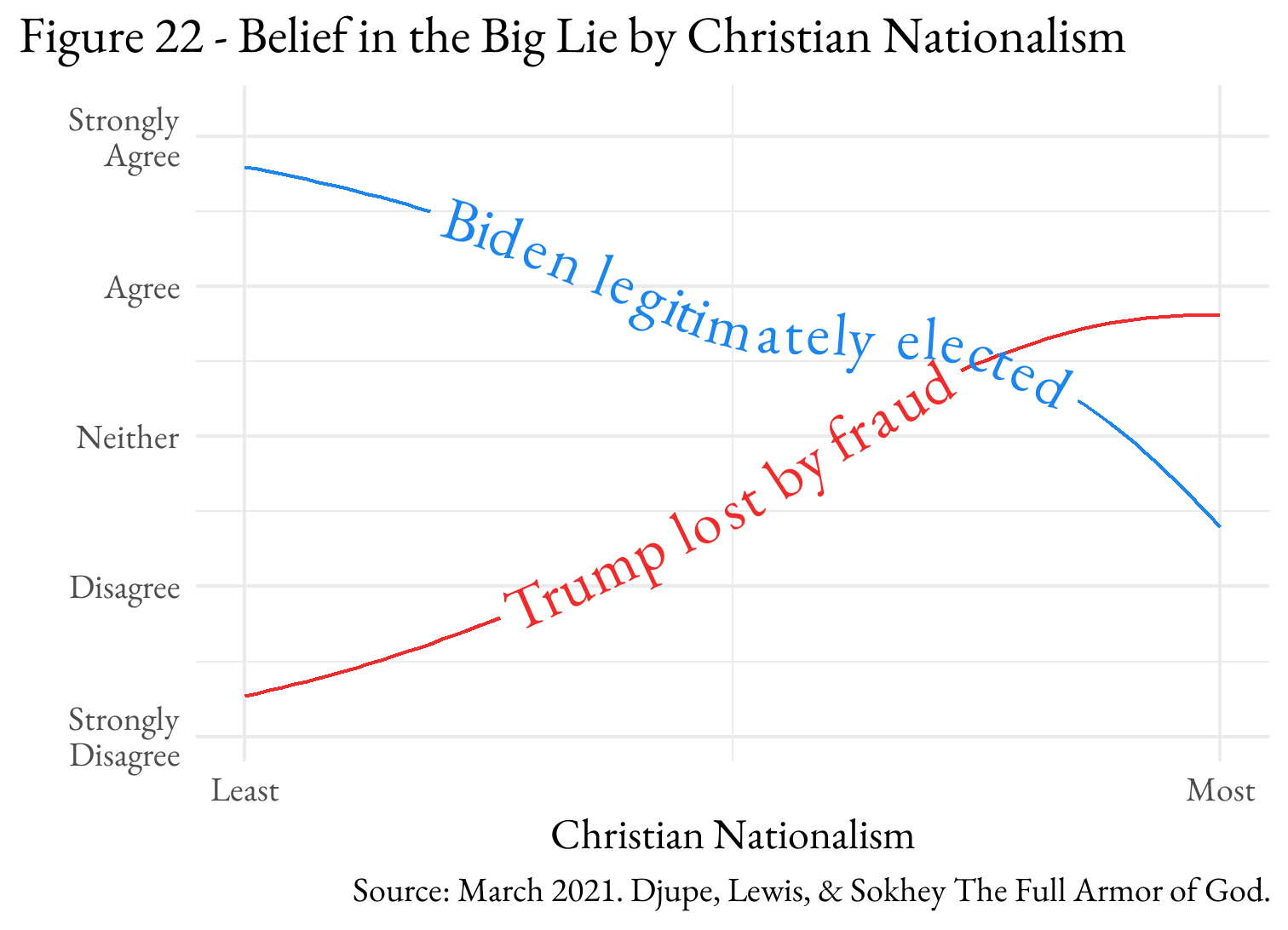 Another way to see that is in their swallowing of the Big Lie, that the election was stolen from Trump (see Figure 22). Ardent Christian nationalists were likely to agree that Trump lost by fraud and disagree that Biden was legitimately elected.