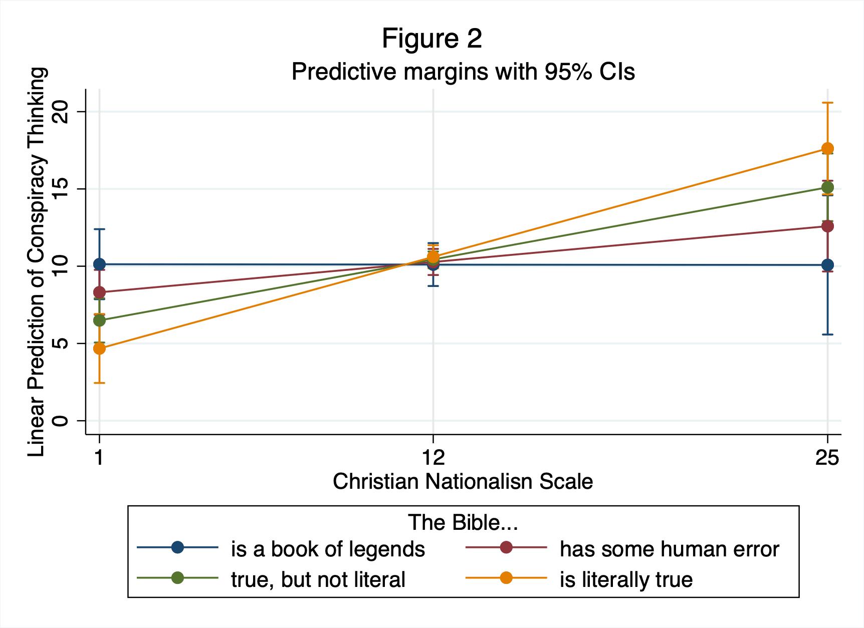 We find that both Christian nationalism and biblical literalism have an impact on an individual’s likelihood of adopting generalized conspiracy thinking. As people express both higher levels of Christian nationalism and higher levels of biblical literalism, they are more likely to express conspiracy thinking.